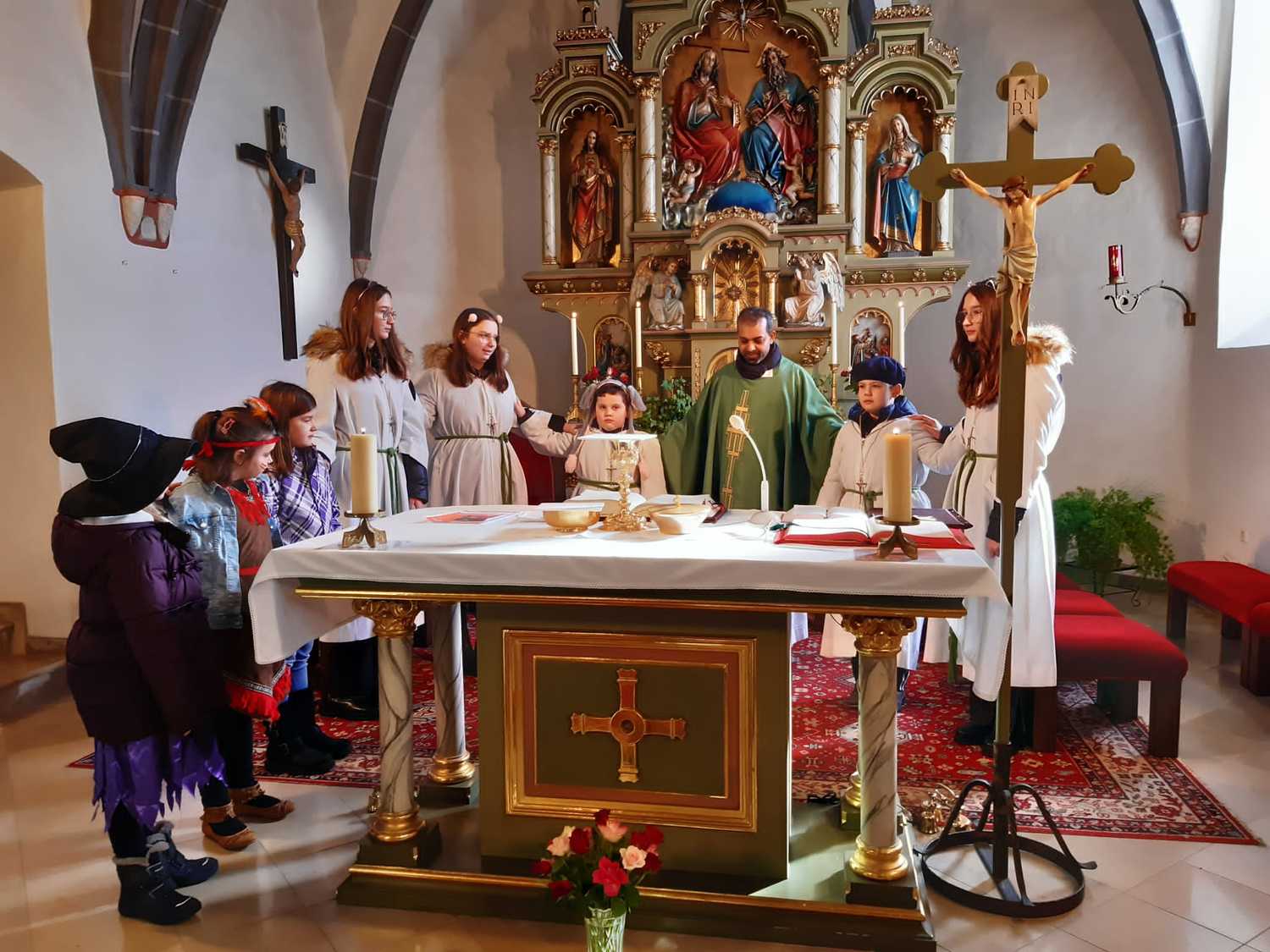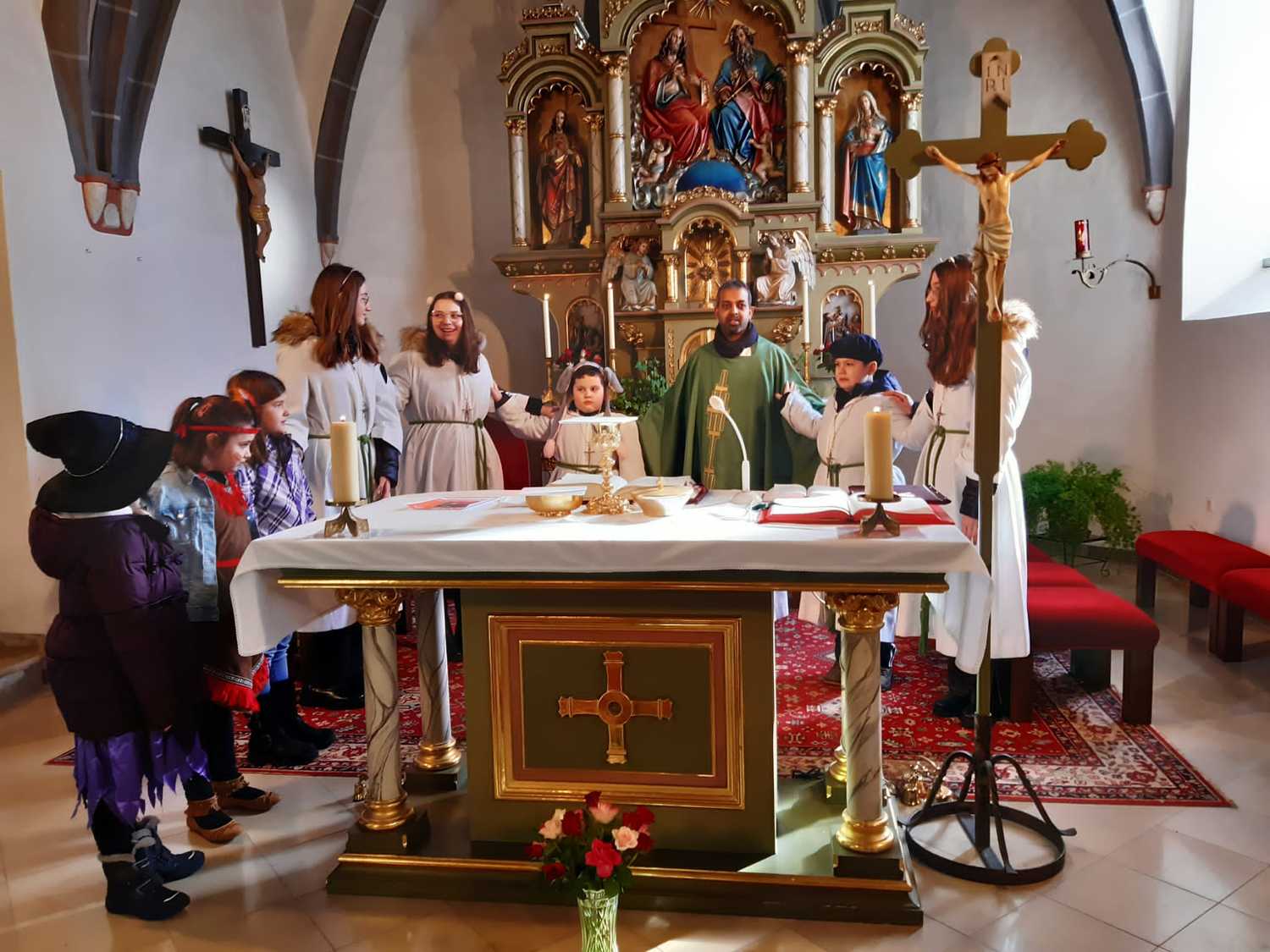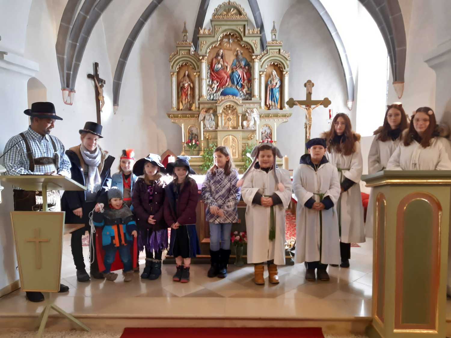 Viele Kinder und auch einige Erwachsenen kamen in ihren lustigen Kostümen um gemeinsam Eucharistie zu feiern. Unser Herr Pfarrer Shinto, der als „Steirerbua“ in Lederhose zum Gottesdienst kam, erzählte uns anstatt der Predigt die Legende vom betenden Gaukler, der er uns gezeigt hat, wie er sein Herz in sein Gebet legte. Seine Art Gott zu loben, danken und ehren sollte für uns alle ein Beispiel sein.