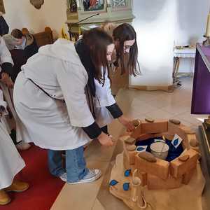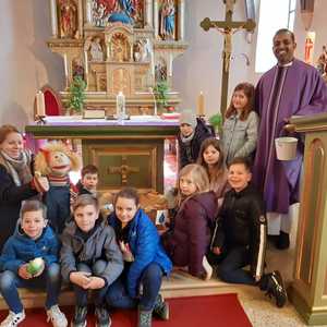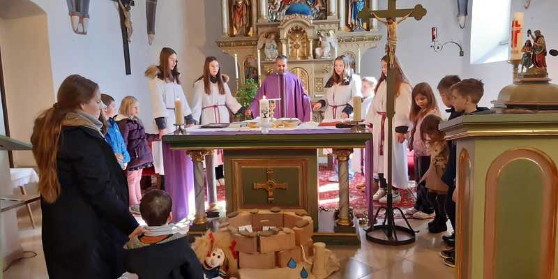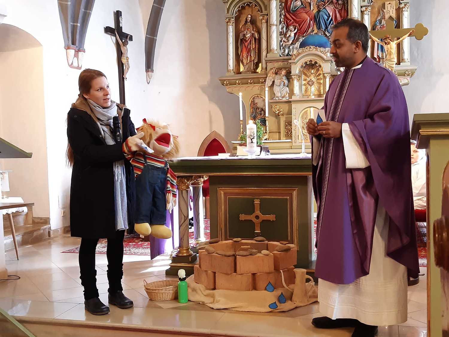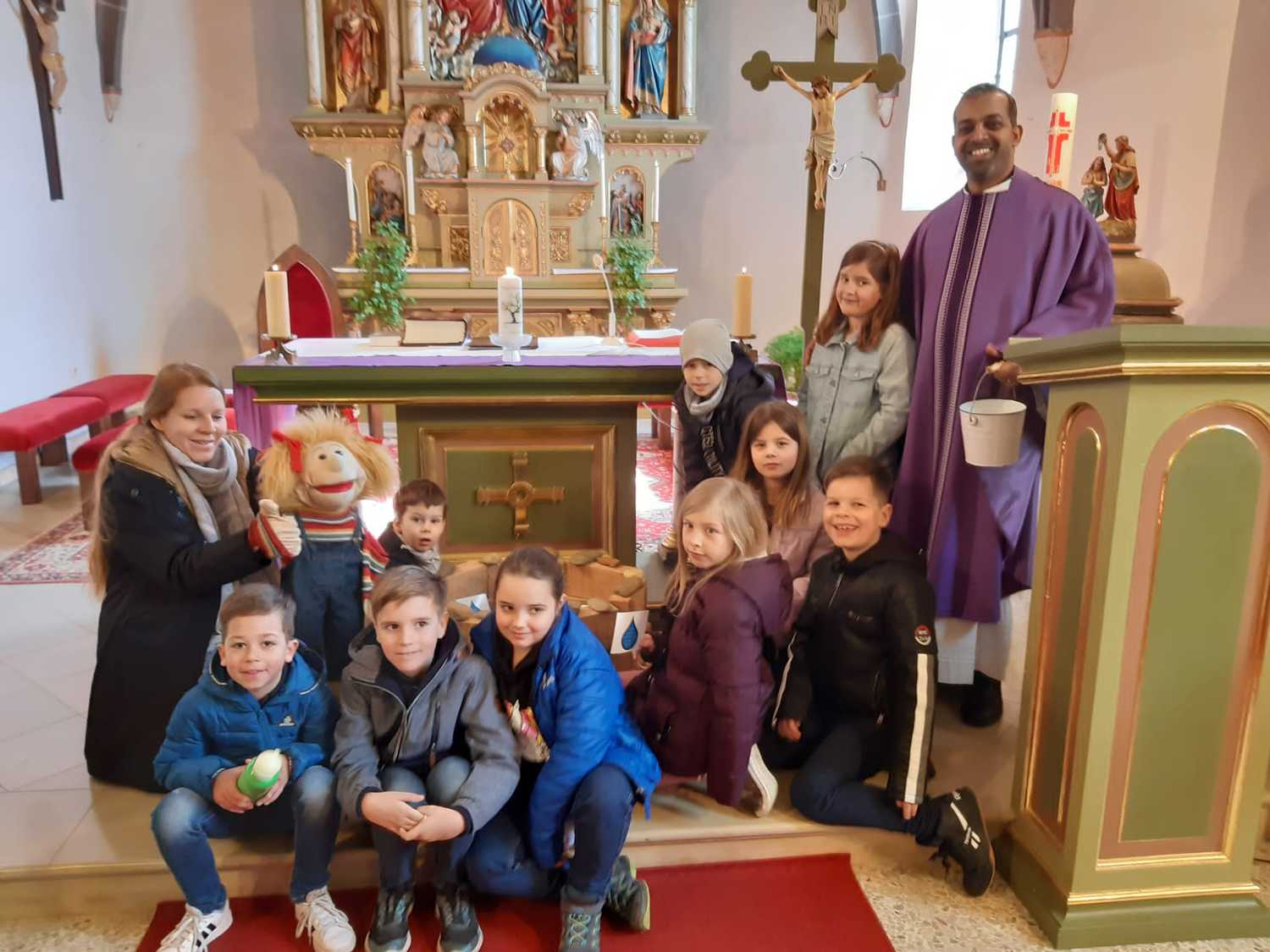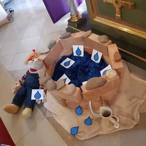 Zu dieser Bibelstelle gestaltete sich am 3. Fastensonntag, 12.März 2023 der Kindergottesdienst und das Thema lebendiges Wasser zog sich wie ein roter Faden durch die Hl.Messe. So bauten die Kinder nach dem Einzug in die Kirche vor dem Altar aus Steinen einen Brunnen, bei dem die Handpuppe Maja bei der Predigt mit Pfarrer Shinto ins Gespräch kam. Dabei wurde so manch offene Frage geklärt, was eigentlich mit lebendigem Wasser gemeint war.