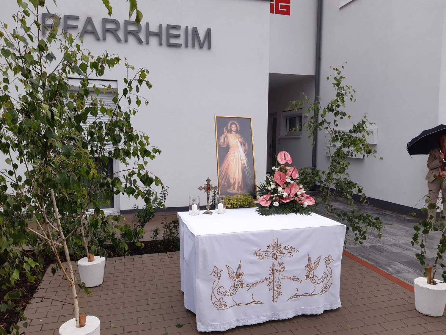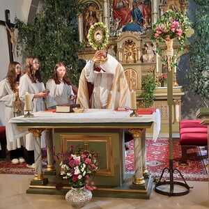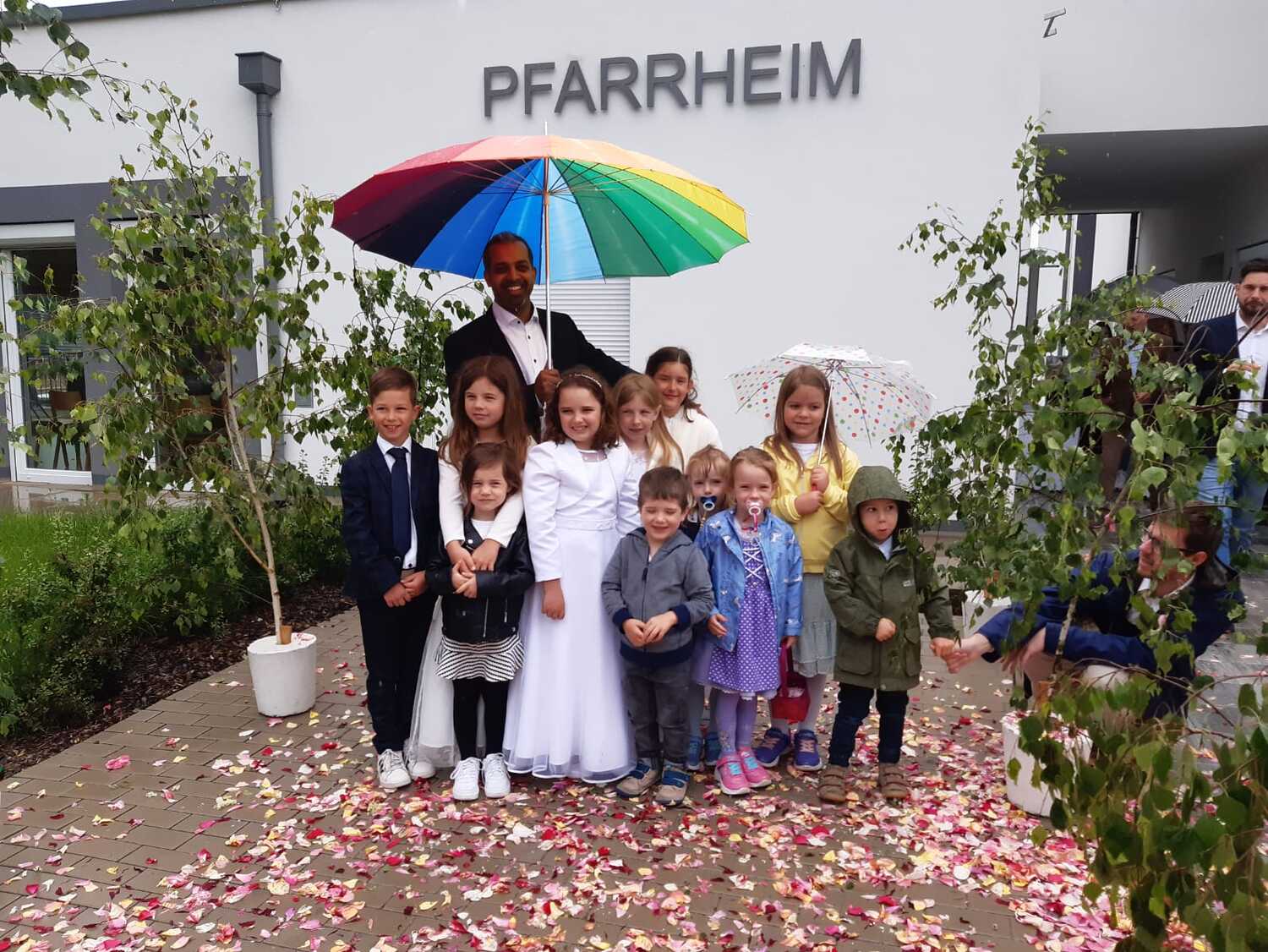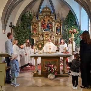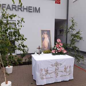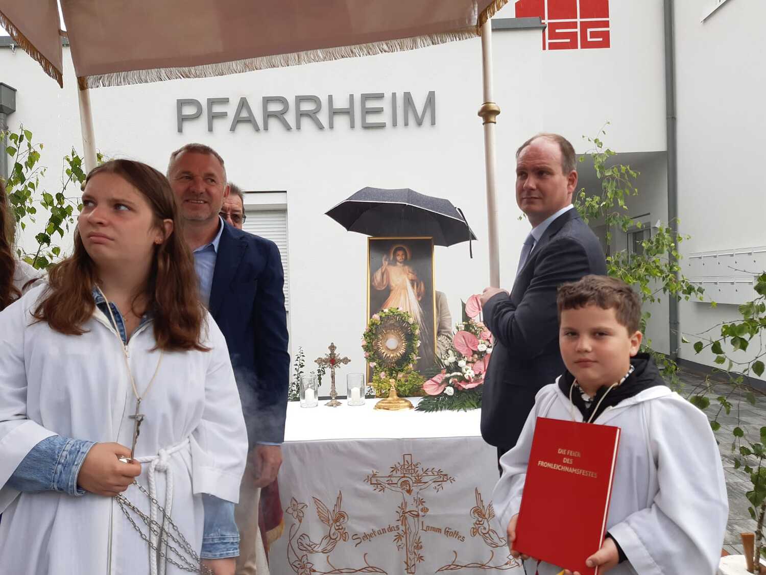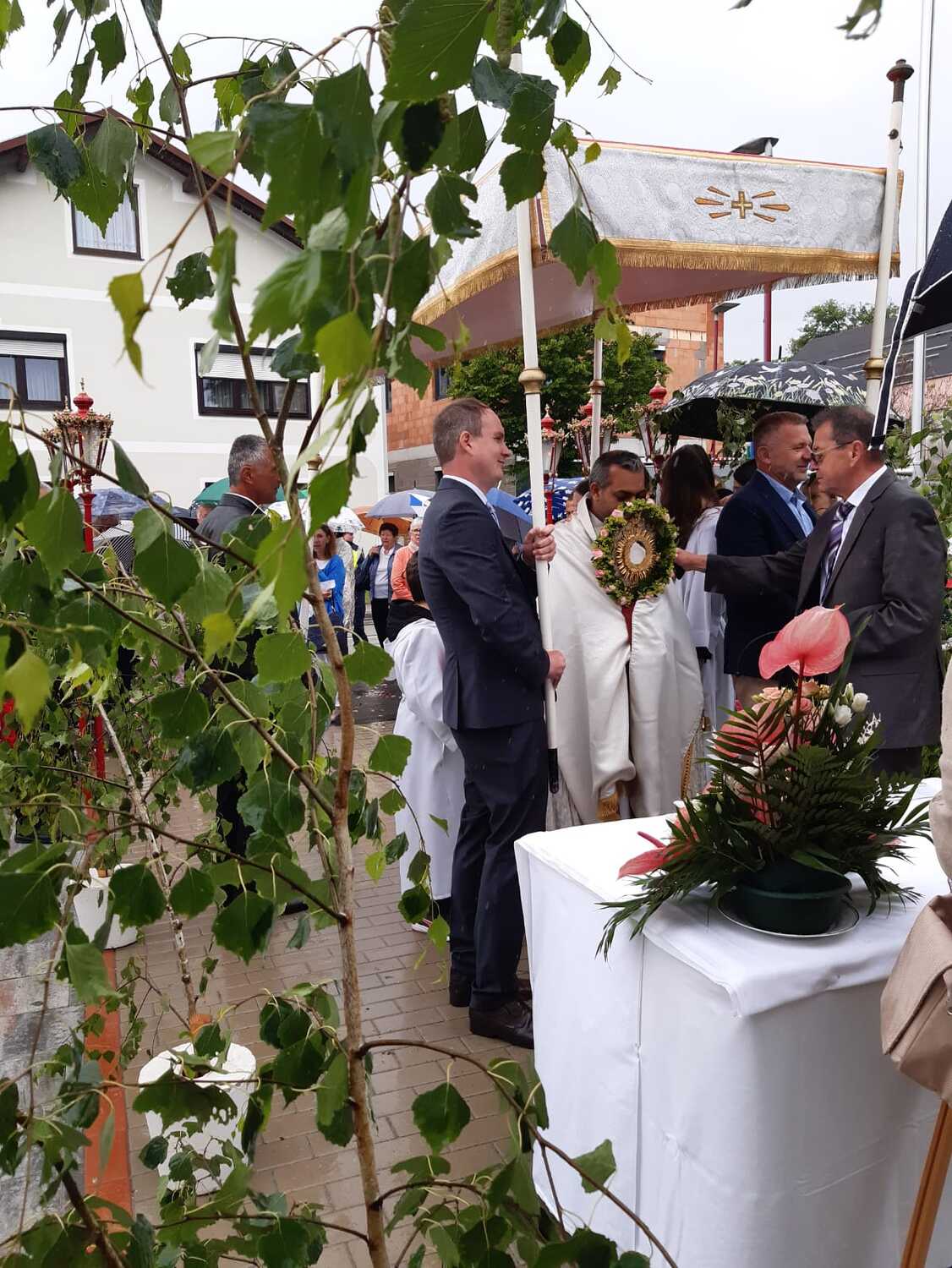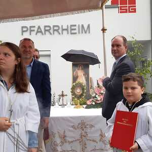 Der Ablauf des Festes musste jedoch wegen des schlechten Wetters kurzfristig geändert werden. Die 1. Station wurde in der Kirche gebetet. Der Weg zum naheliegenden Pfarrheim, wo die 2. Station war, wurde trotz Regen auf sich genommen. Eine besondere Freude hatten die Kinder, die auch ihre Blumen streuen konnten. Die Ministranten und die Erstkommunionkinder haben an beiden Stationen das Vortragen der Fürbitten übernommen.