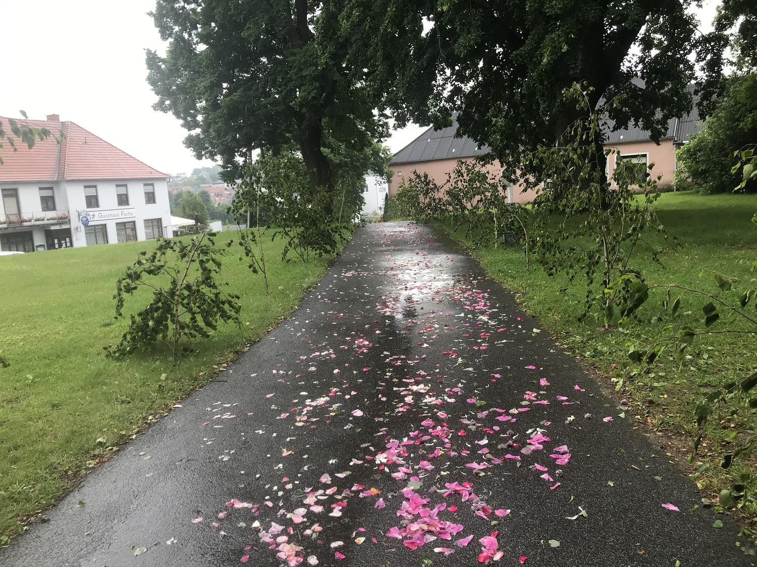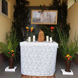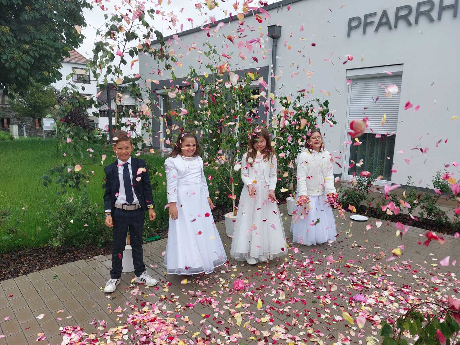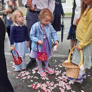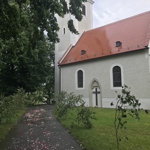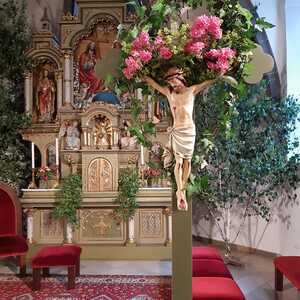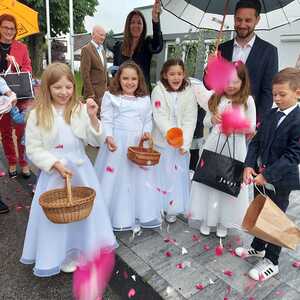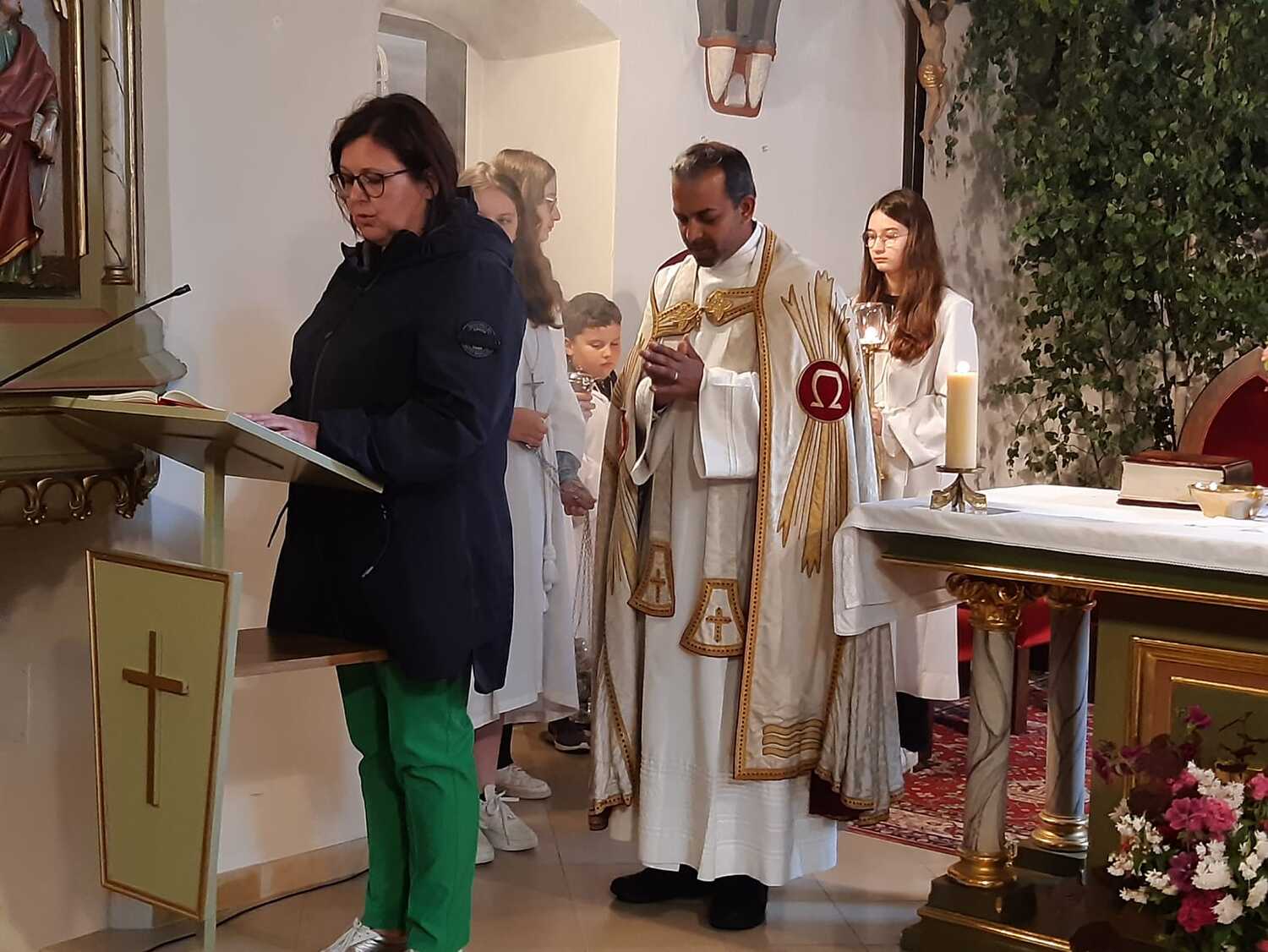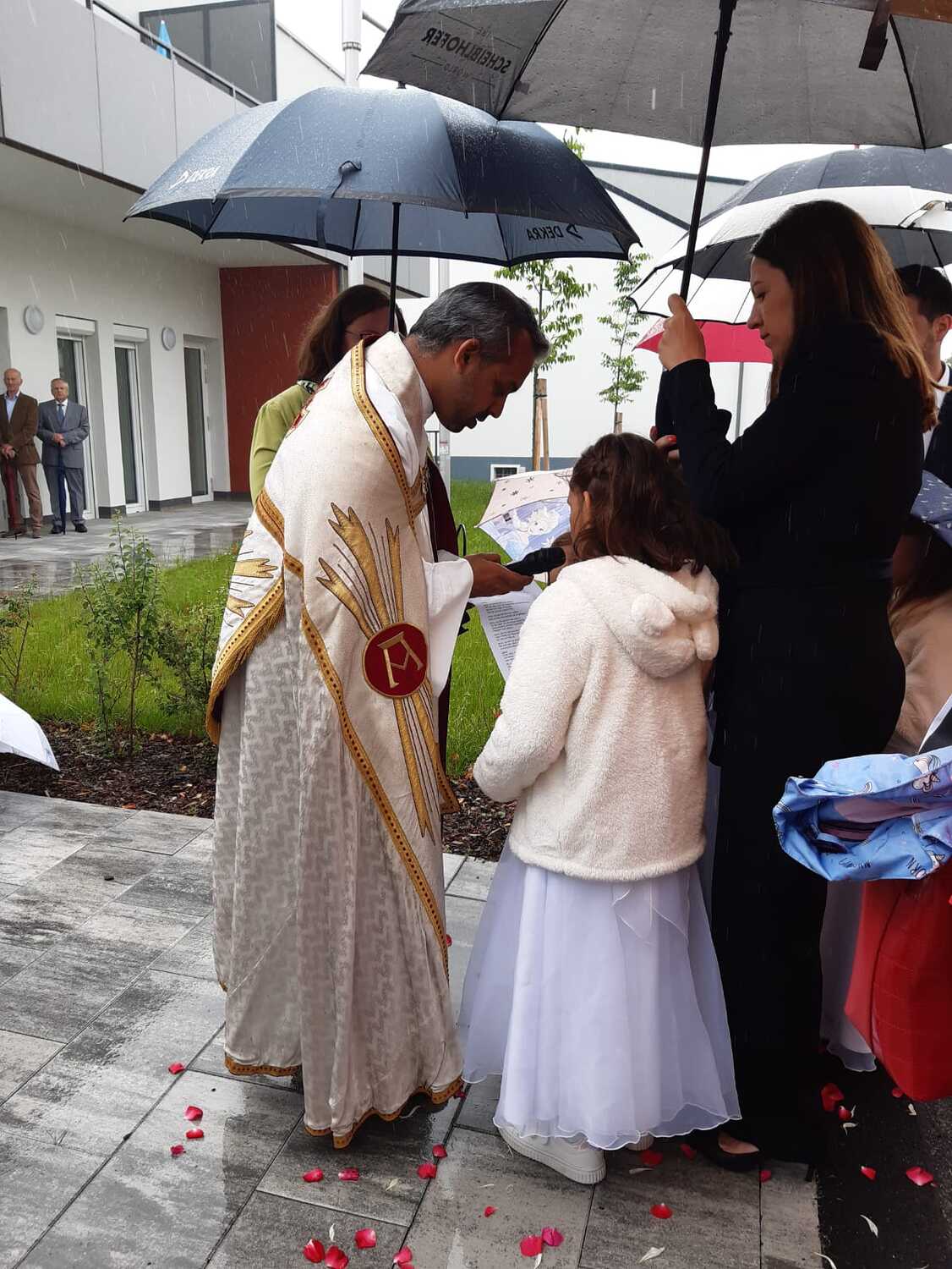 Der Ablauf des Festes musste jedoch wegen des schlechten Wetters kurzfristig geändert werden. Die 1. Station wurde in der Kirche gebetet. Der Weg zum naheliegenden Pfarrheim, wo die 2. Station war, wurde trotz Regen auf sich genommen. Eine besondere Freude hatten die Kinder, die auch ihre Blumen streuen konnten. Die Ministranten und die Erstkommunionkinder haben an beiden Stationen das Vortragen der Fürbitten übernommen.