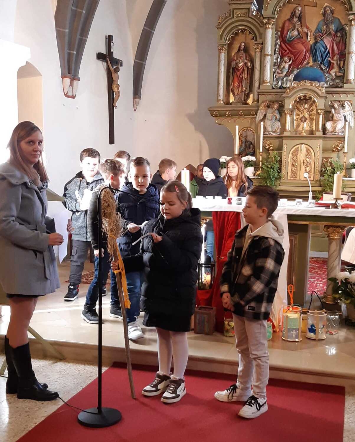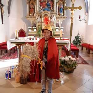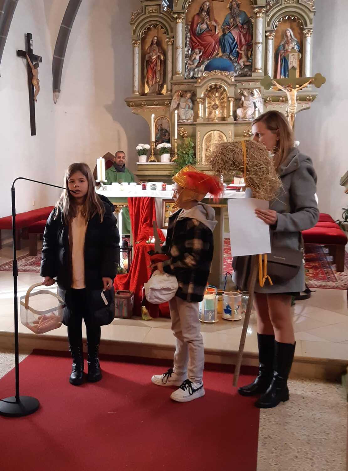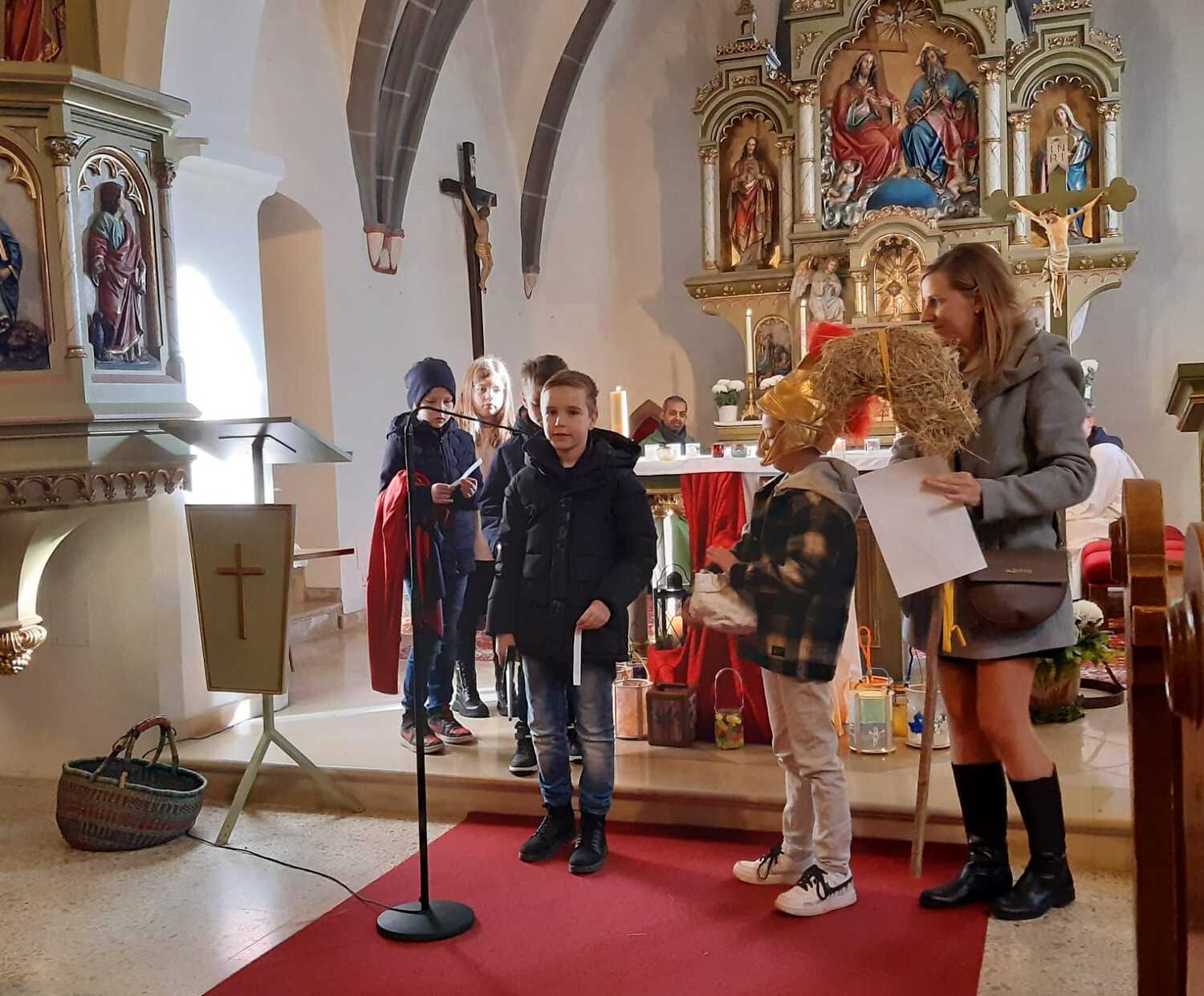Nach der Predigt präsentierten die Kinder ein Martinsspiel der etwas anderen Art. Der Hl. Martin soll eine wichtige Botschaft in die nächste Stadt bringen und die Menschen wollen ihm dabei helfen und teilen mit ihm verschiedene Dinge für seine Reise. Aber auch Zuversicht und Mut haben ihm die Menschen mitgegeben.