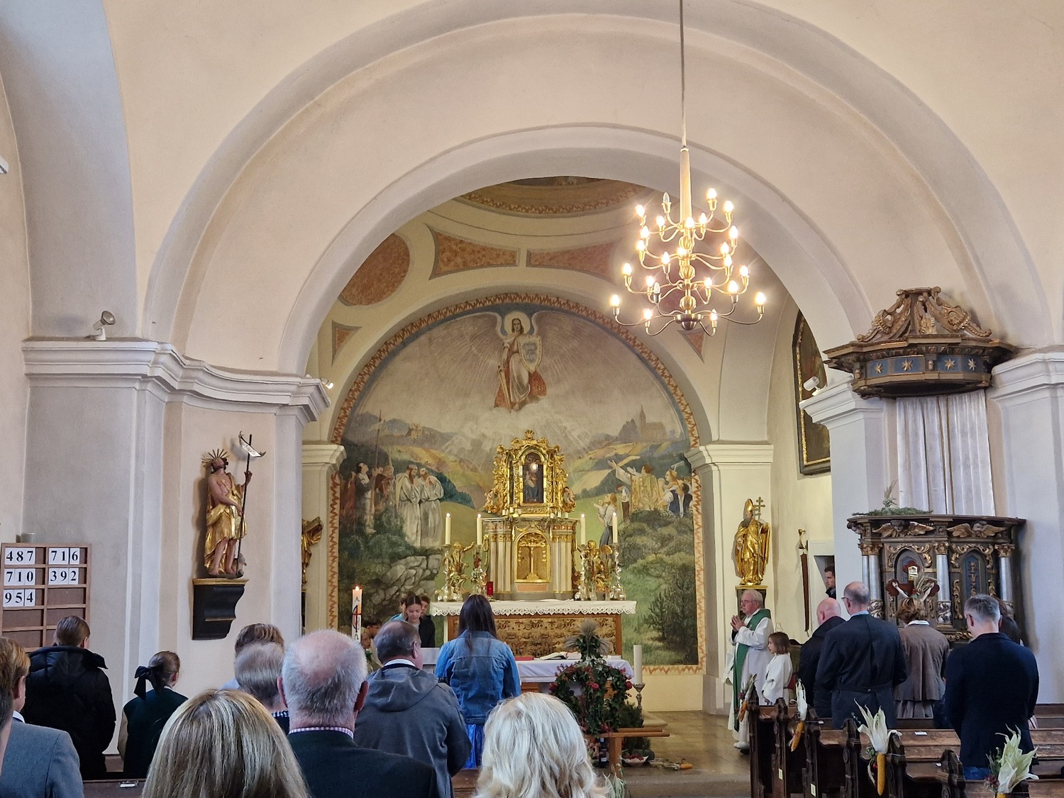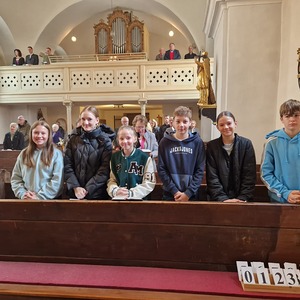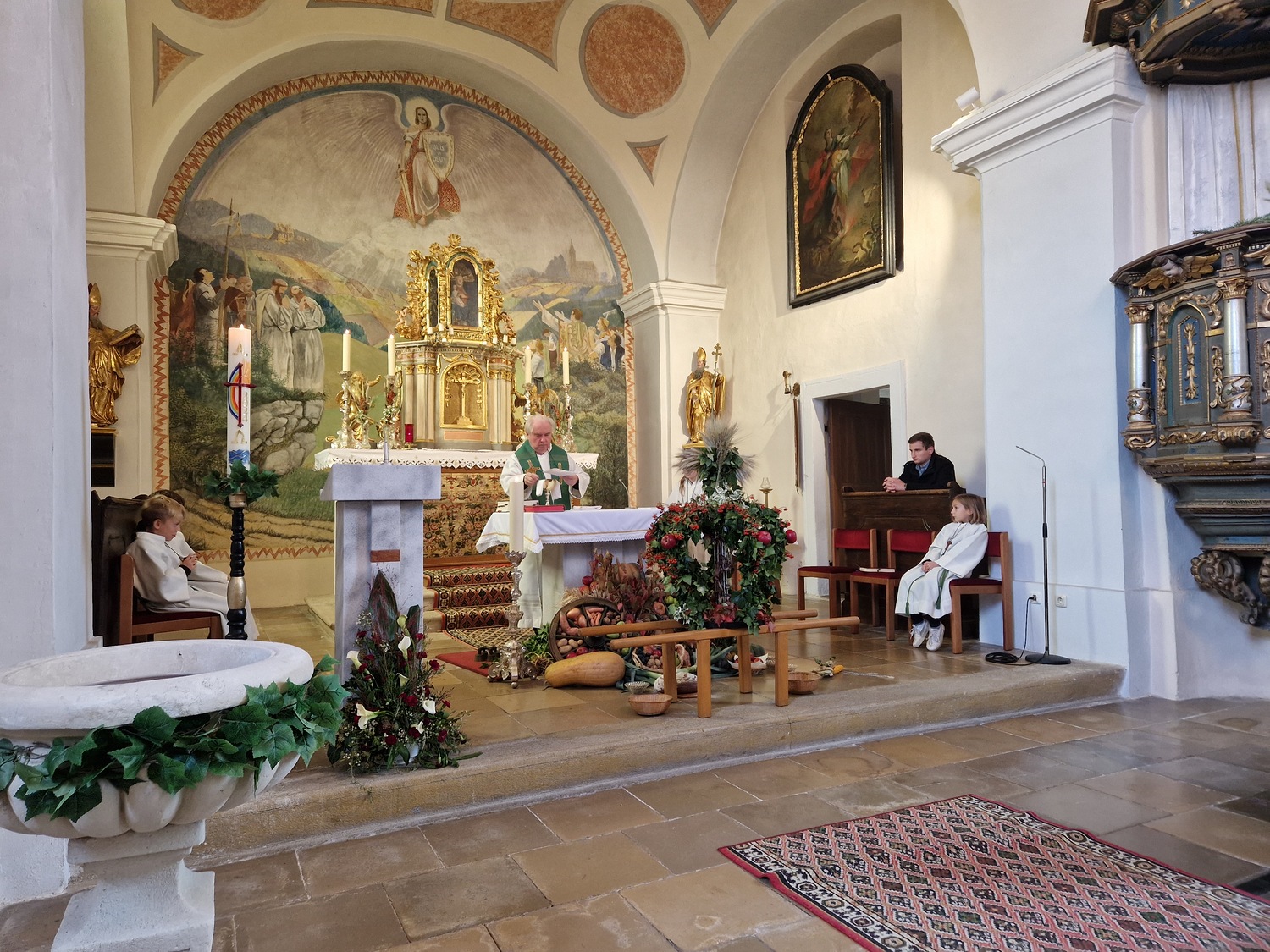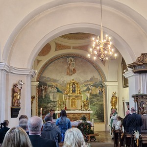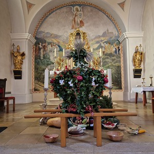 Für die Erntedankfeier wurde die Kirche mit viel Obst und Gemüse geschmückt. Beim feierlichen Einzug mit Erntekrone und Gaben hatten die Kinder und Firmlinge alle Hände voll zu tun. Nach der Eucharistiefeier konnten bei der Agape nette Gespräche geführt werden.
