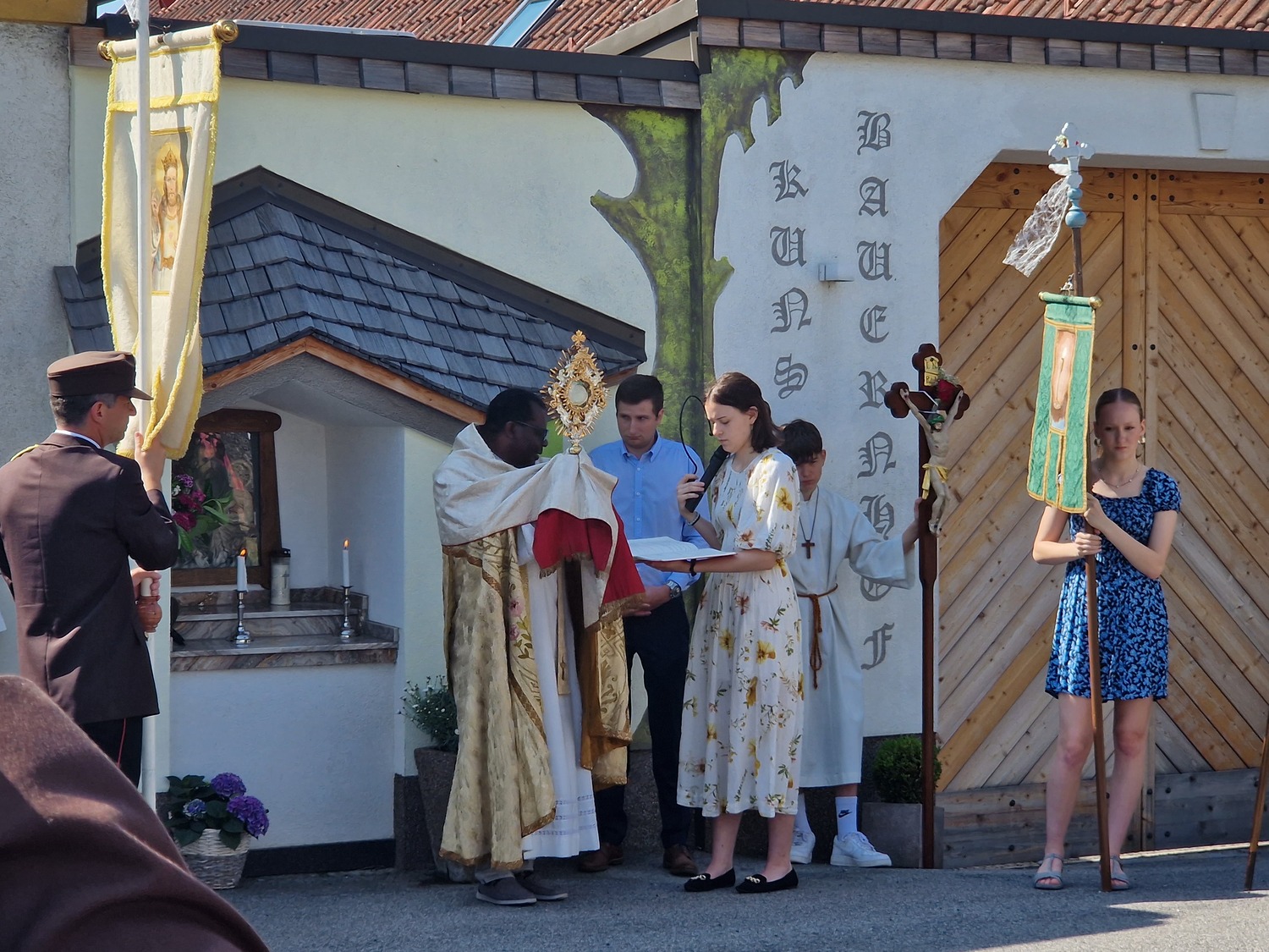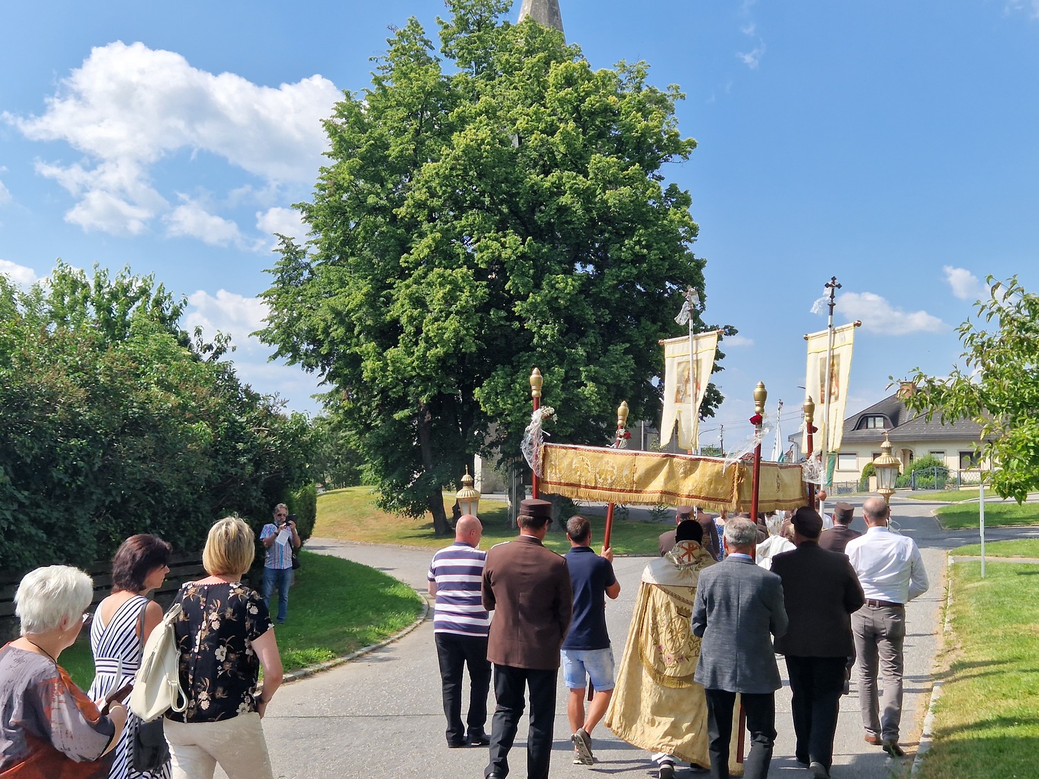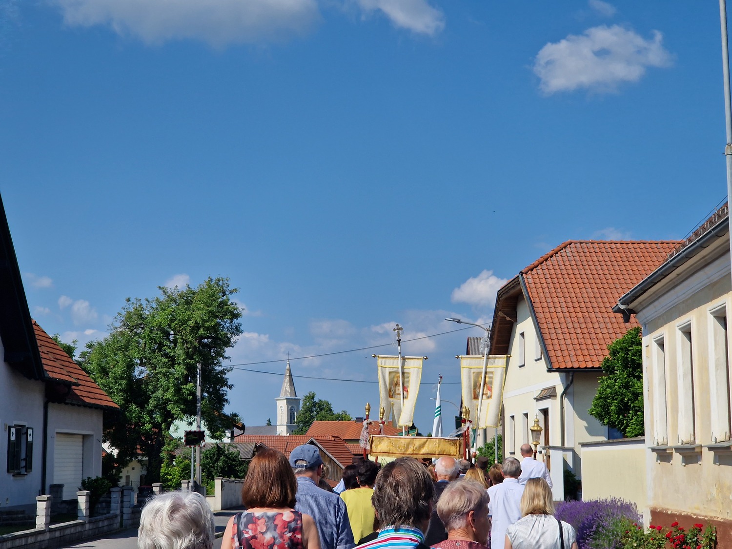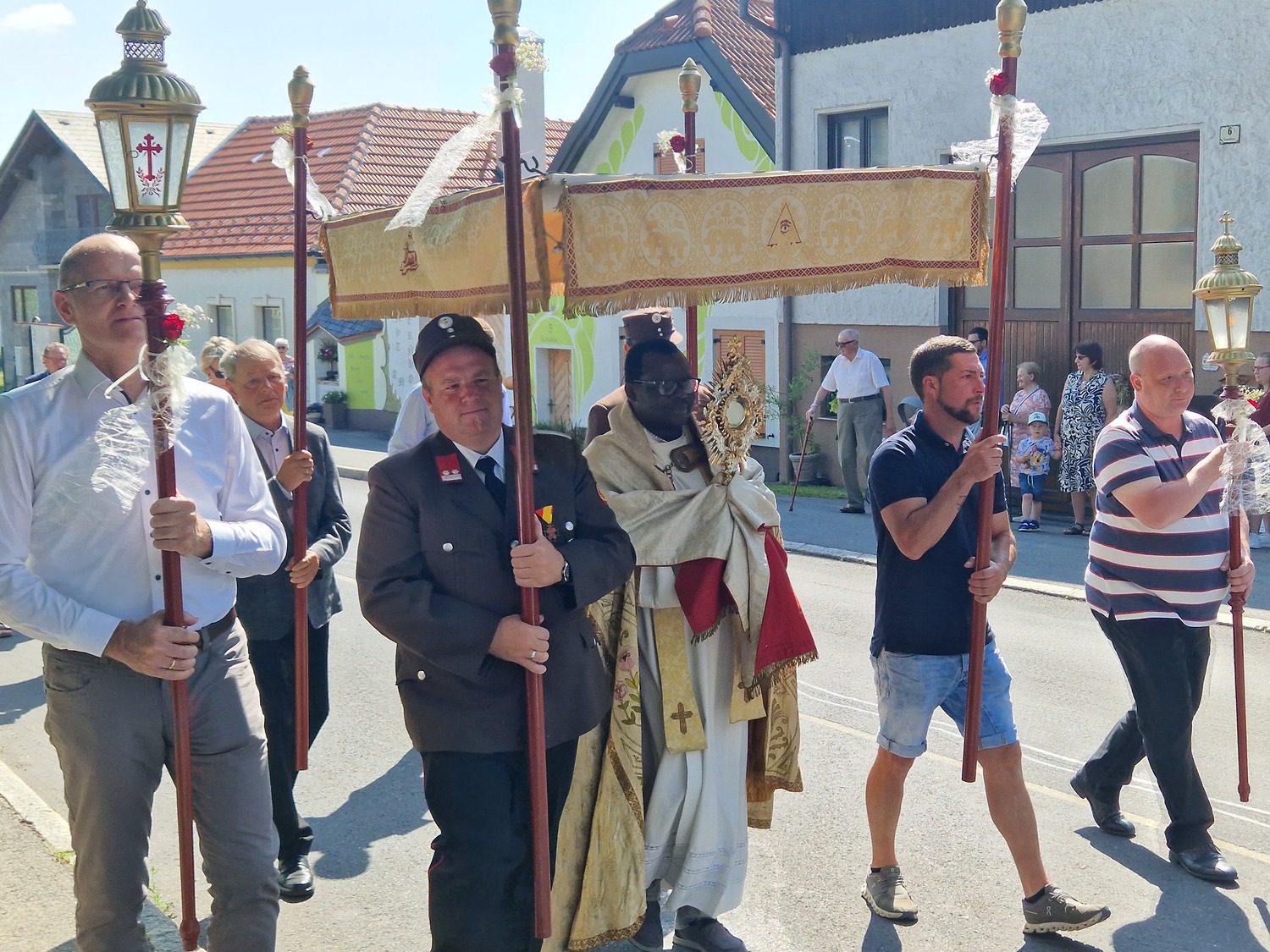Bei sommerlichen Temperaturen fand nach der Heiligen Messe die Fronleichnamsprozession statt. Die Monstranz wurde durch die Ortschaft getragen und bei zwei Stationen spendete Pfarrer Basil den Eucharistischen Segen.