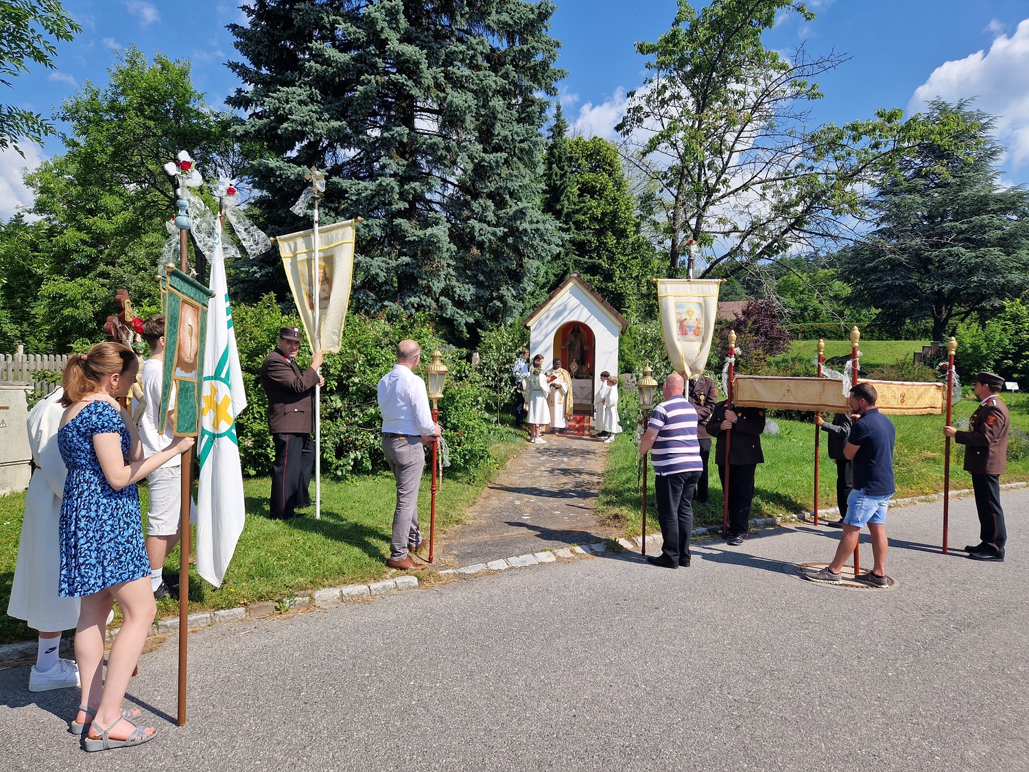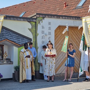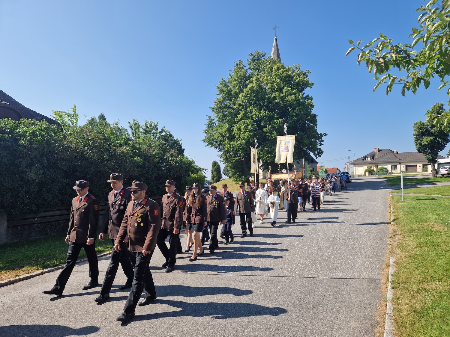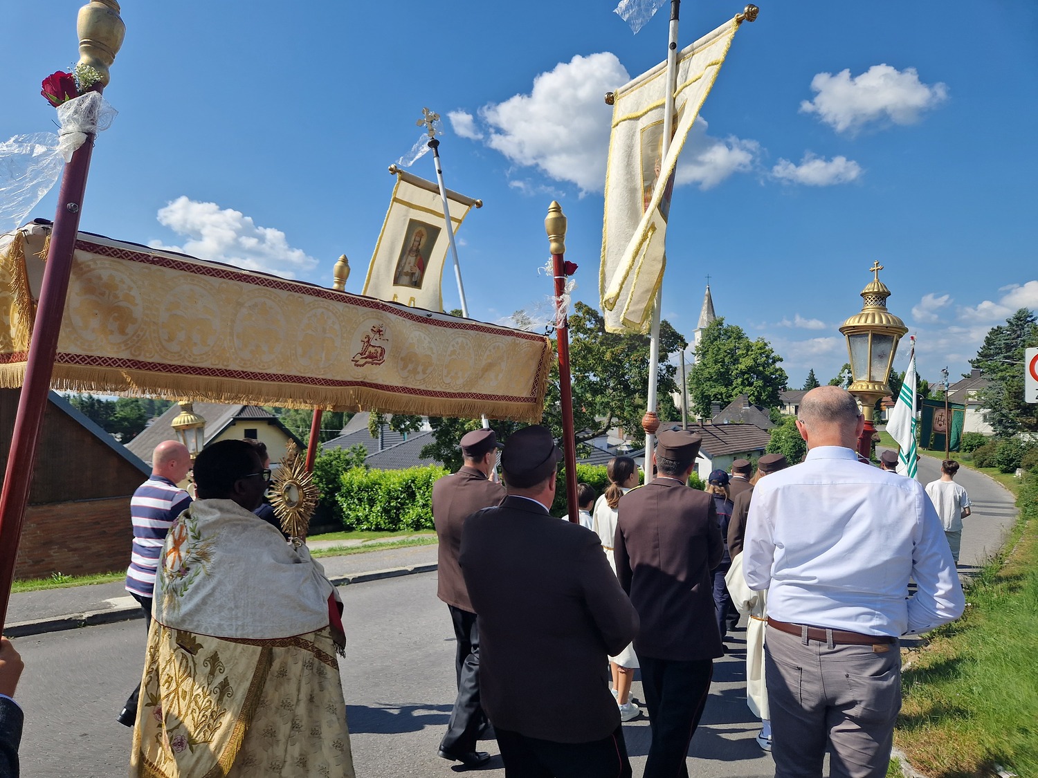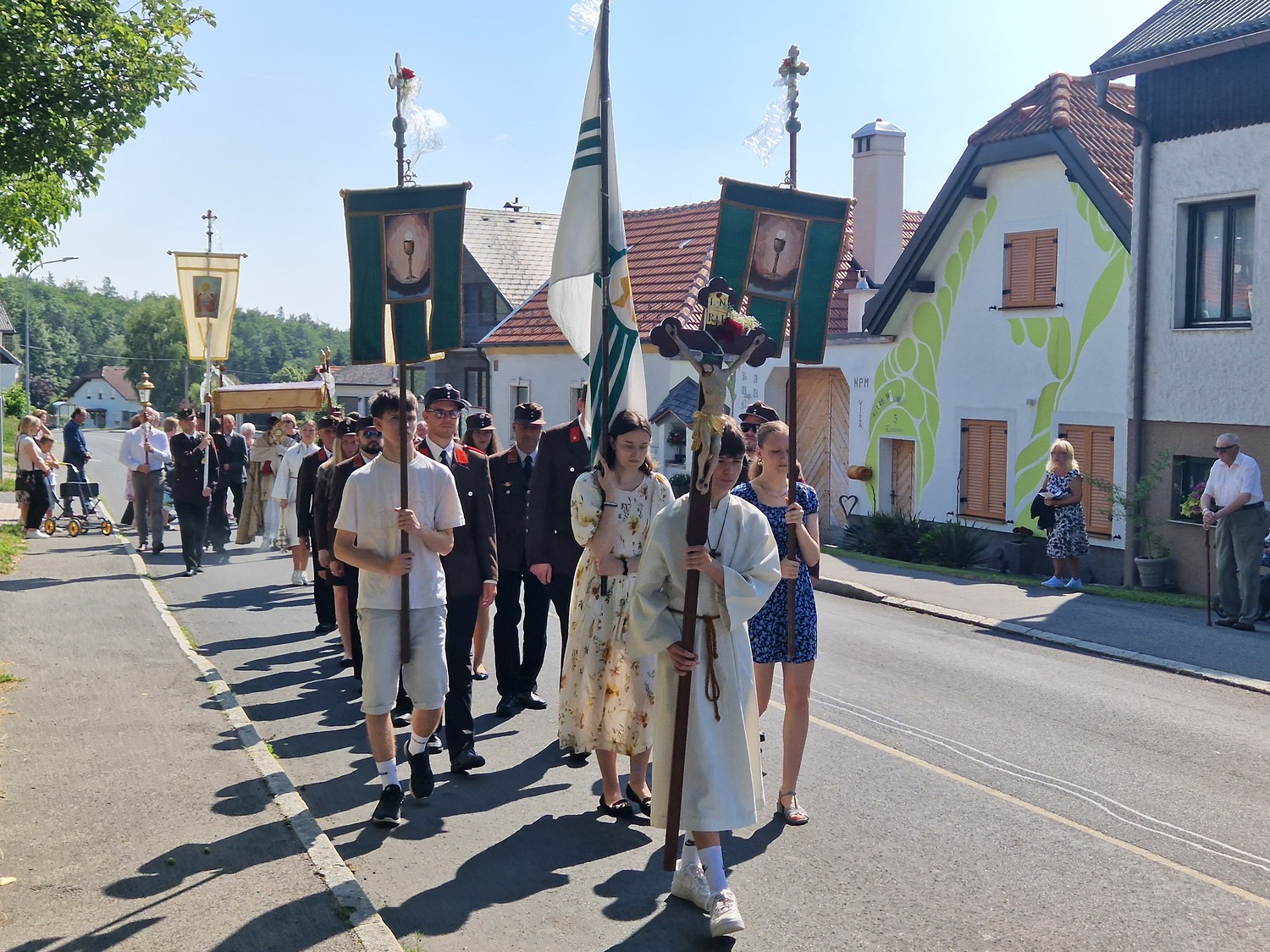 Bei sommerlichen Temperaturen fand nach der Heiligen Messe die Fronleichnamsprozession statt. Die Monstranz wurde durch die Ortschaft getragen und bei zwei Stationen spendete Pfarrer Basil den Eucharistischen Segen.
