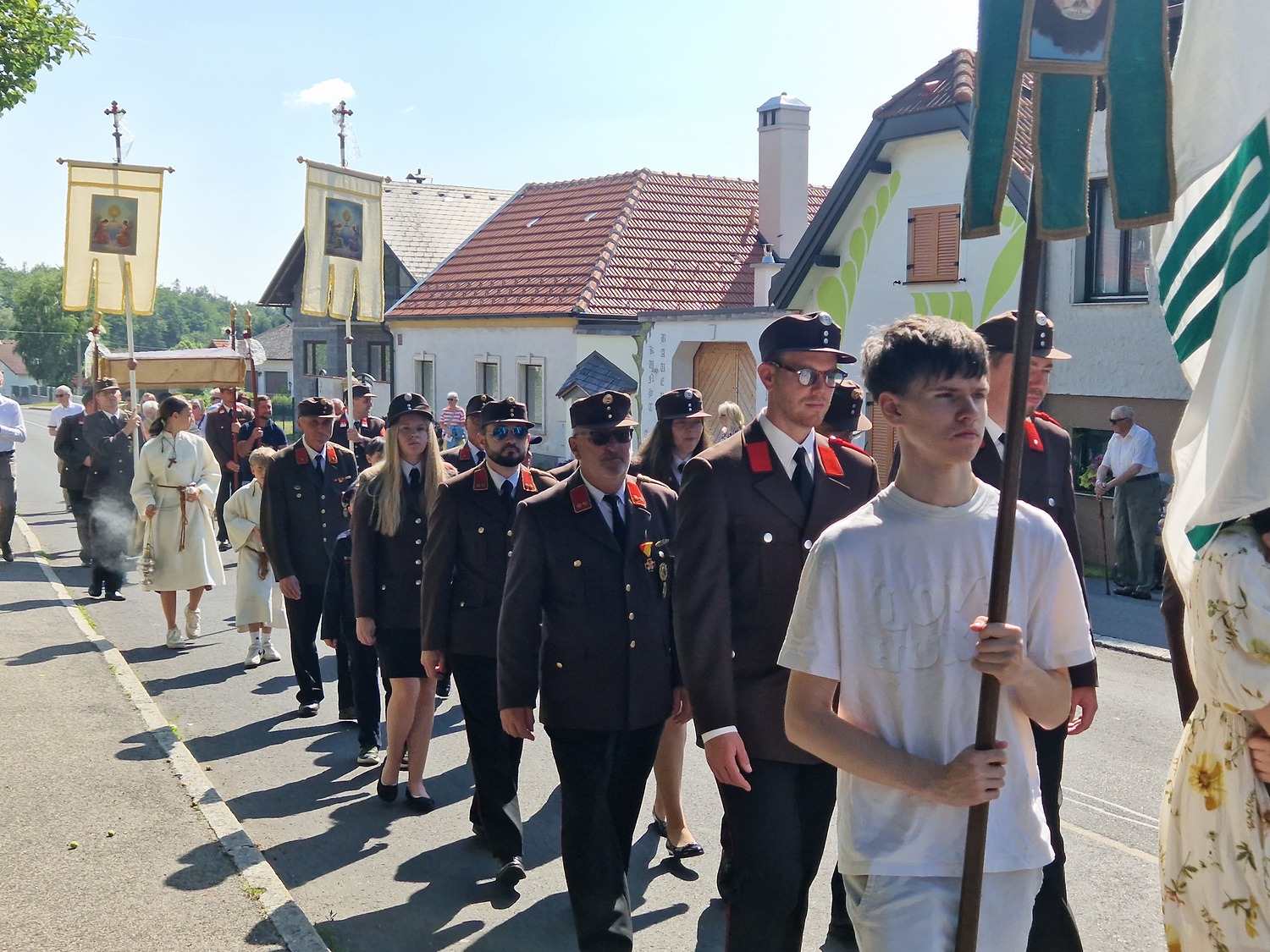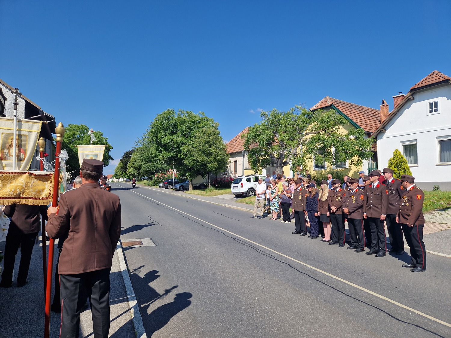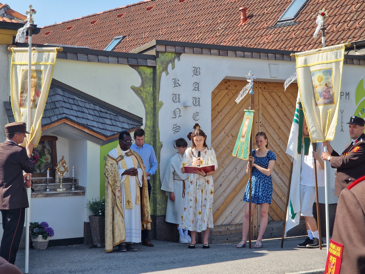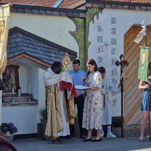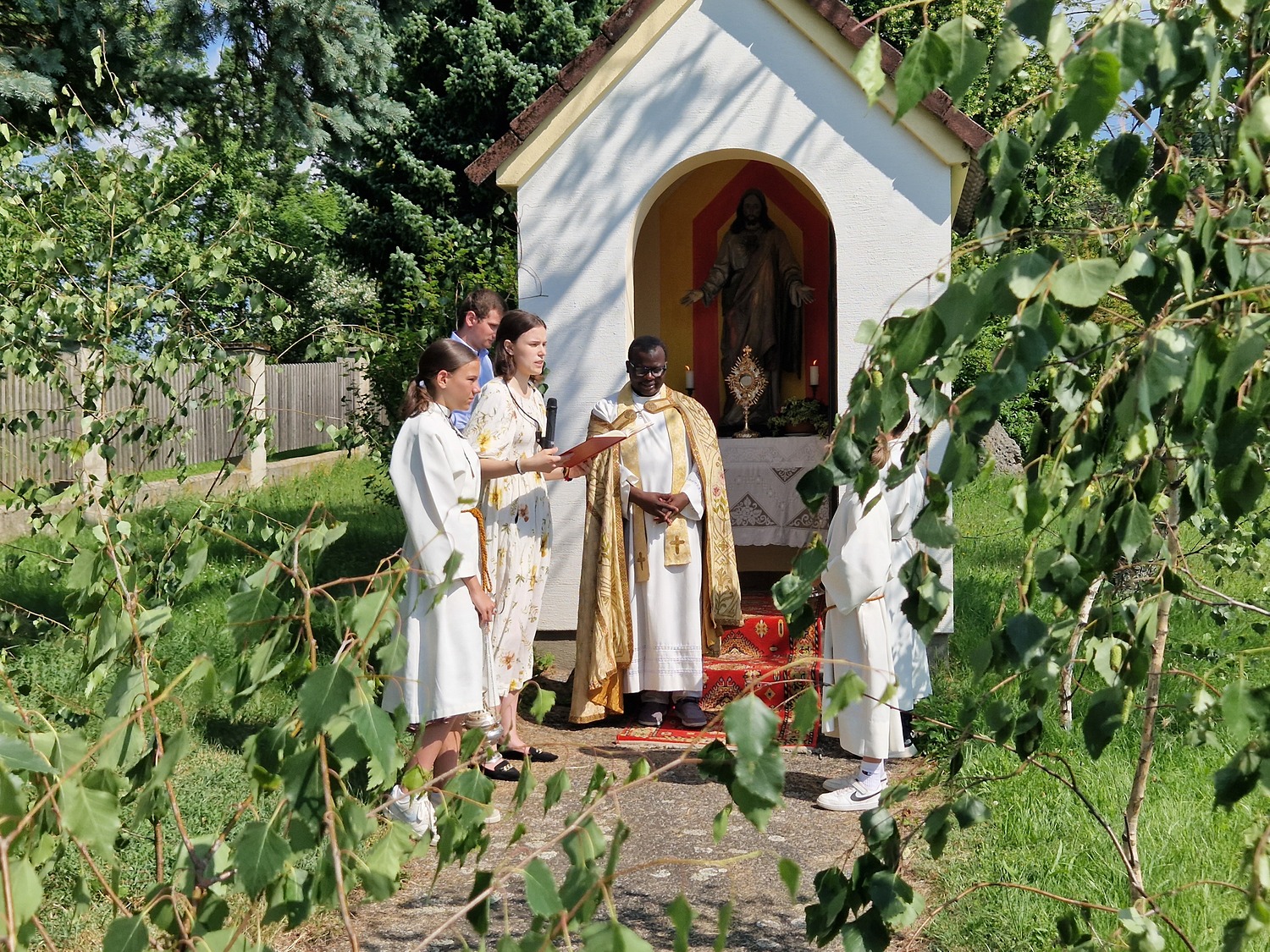 Bei sommerlichen Temperaturen fand nach der Heiligen Messe die Fronleichnamsprozession statt. Die Monstranz wurde durch die Ortschaft getragen und bei zwei Stationen spendete Pfarrer Basil den Eucharistischen Segen.