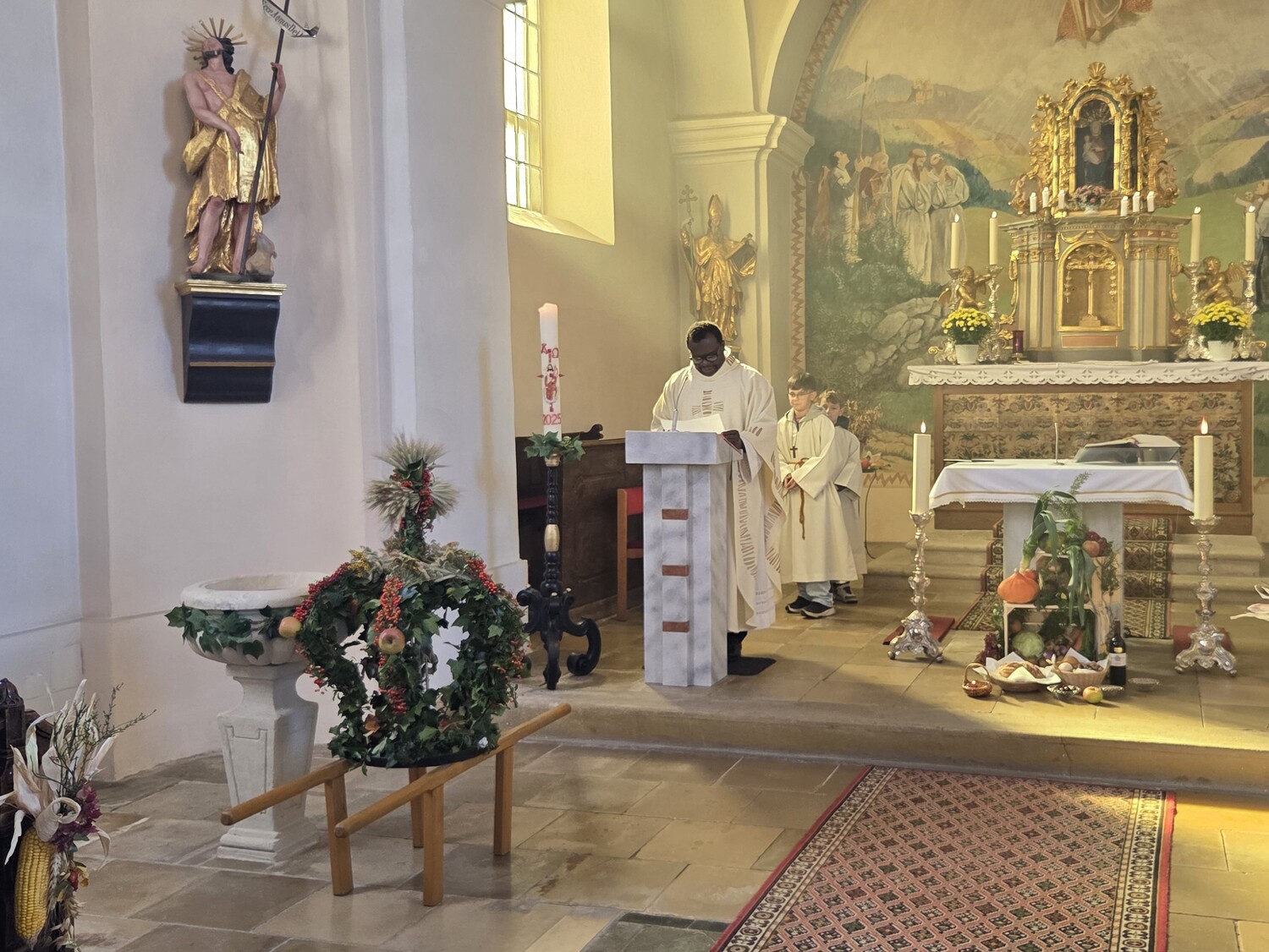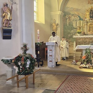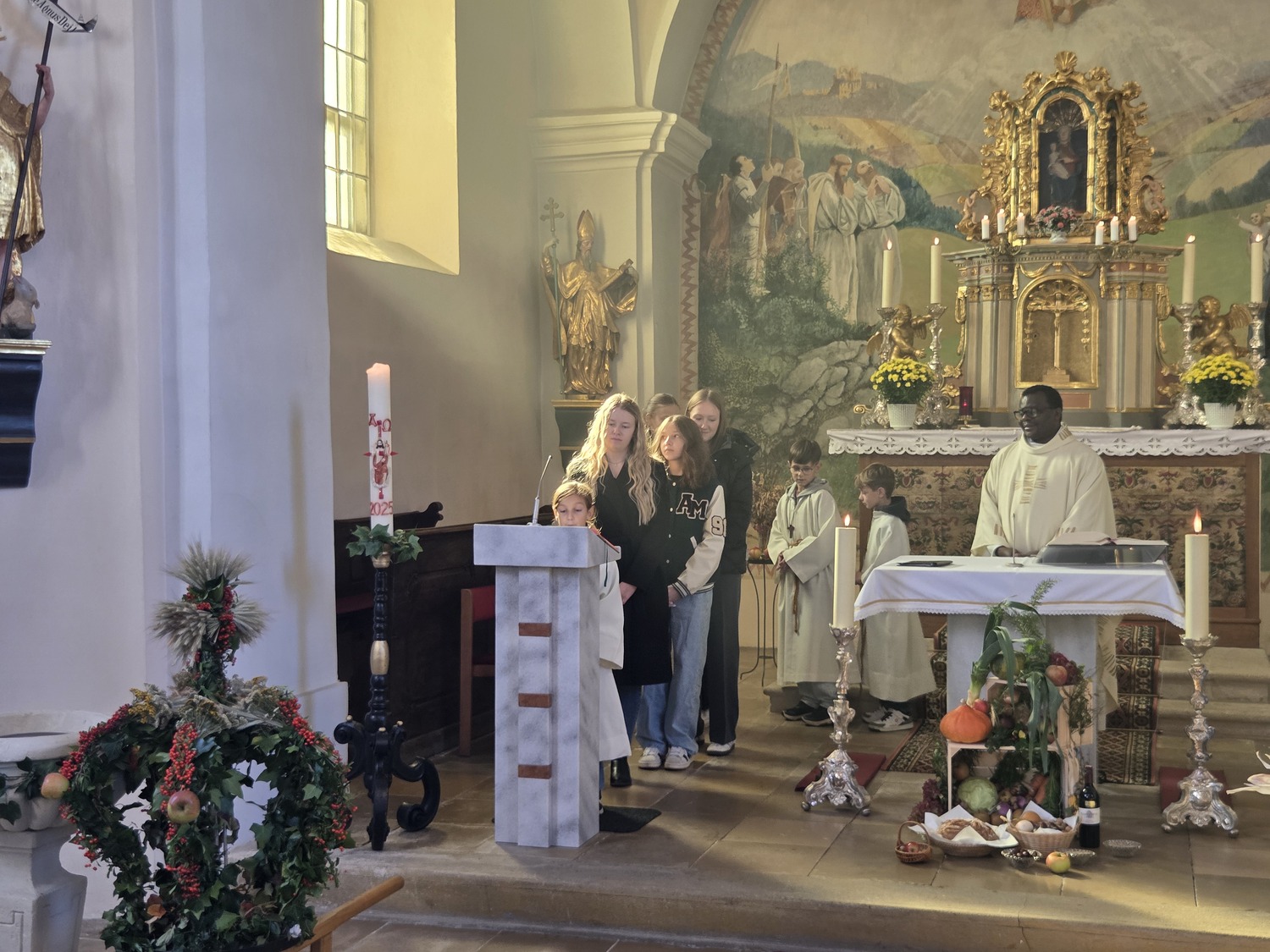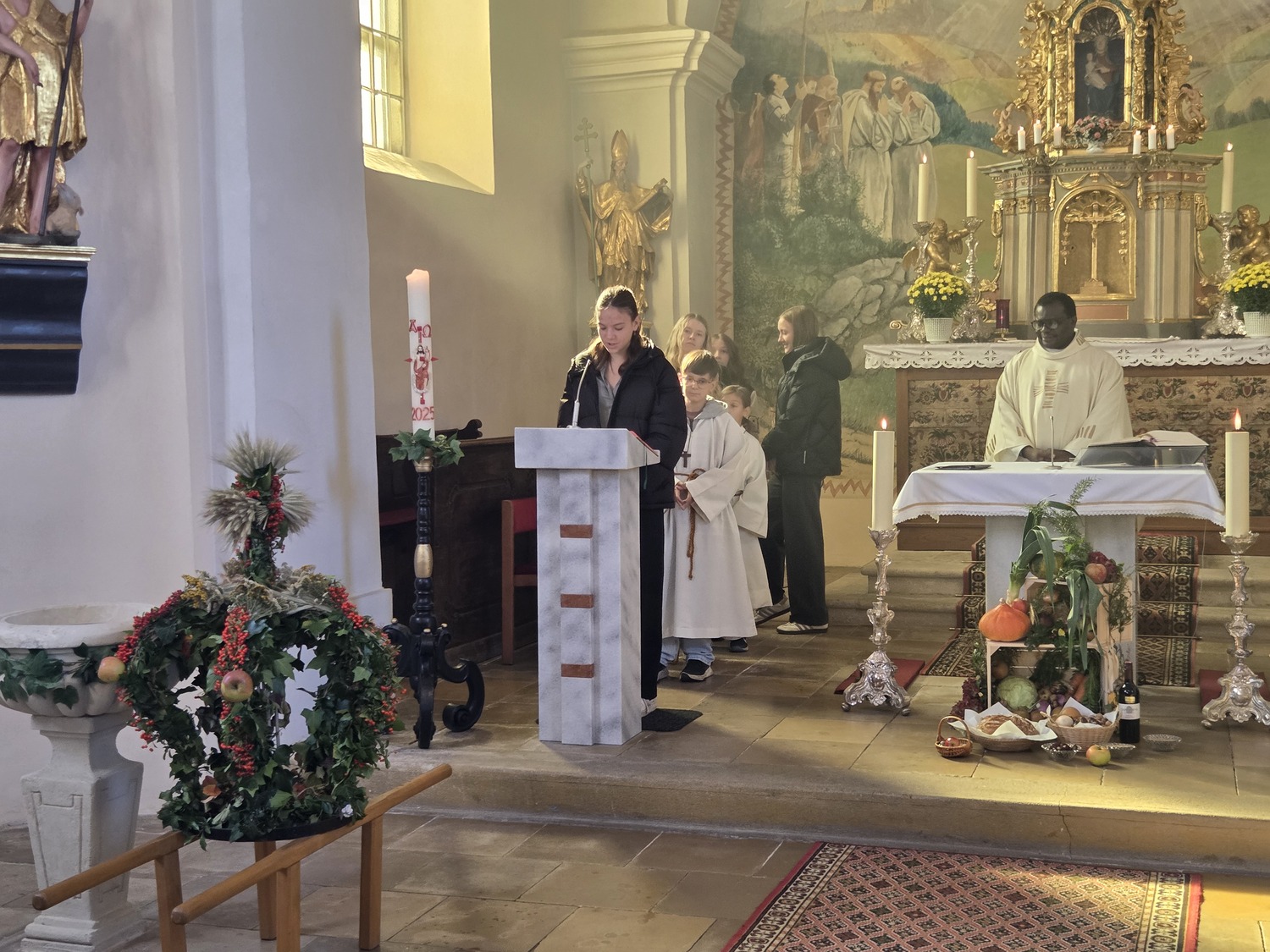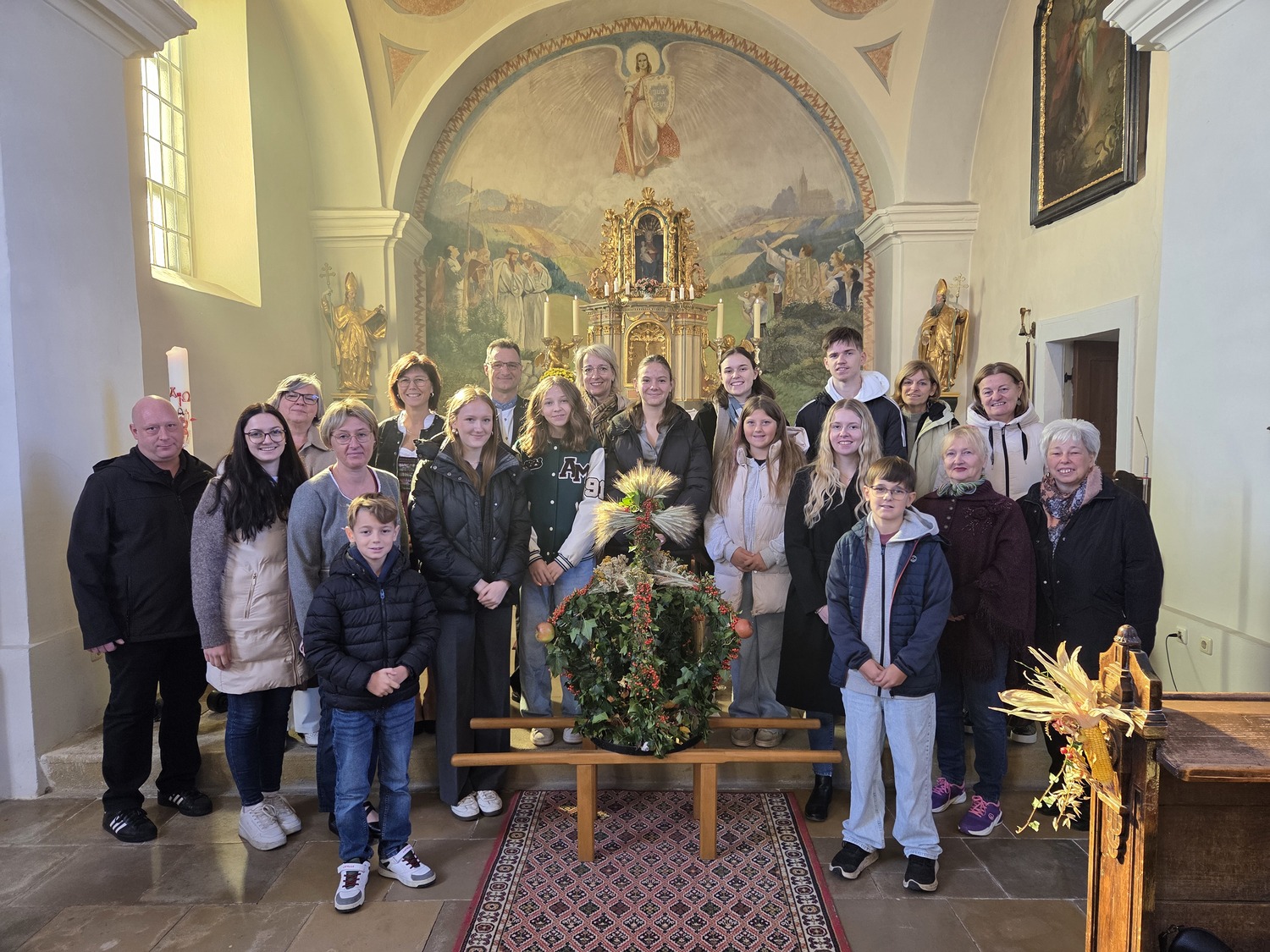 Beim Einzug in die Kirche brachten die Kinder und Jugendlichen alle Gaben zum Altar. Die Erntekrone wurde von Pfarrer Basil gesegnet. Die musikalische Gestaltung übernahm unser Chor. Anschließend gab es bei der Agape ein schönes Beisammensein und es konnten Produkte anlässlich des Weltmissionssonntages gekauft werden.