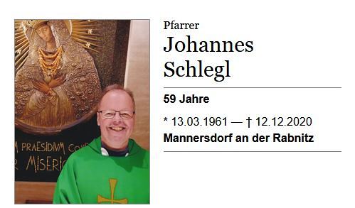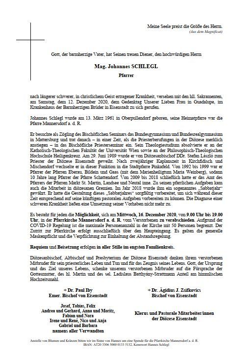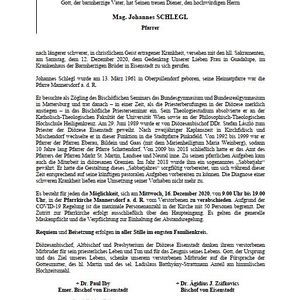 nach längerer schwerer, in christlichem Geist ertragener Krankheit, versehen mit den hl. Sakramenten, am Samstag, dem 12. Dezember 2020, dem Gedenktag Unserer Lieben Frau in Guadalupe, im Krankenhaus der Barmherzigen Brüder in Eisenstadt zu sich gerufen.