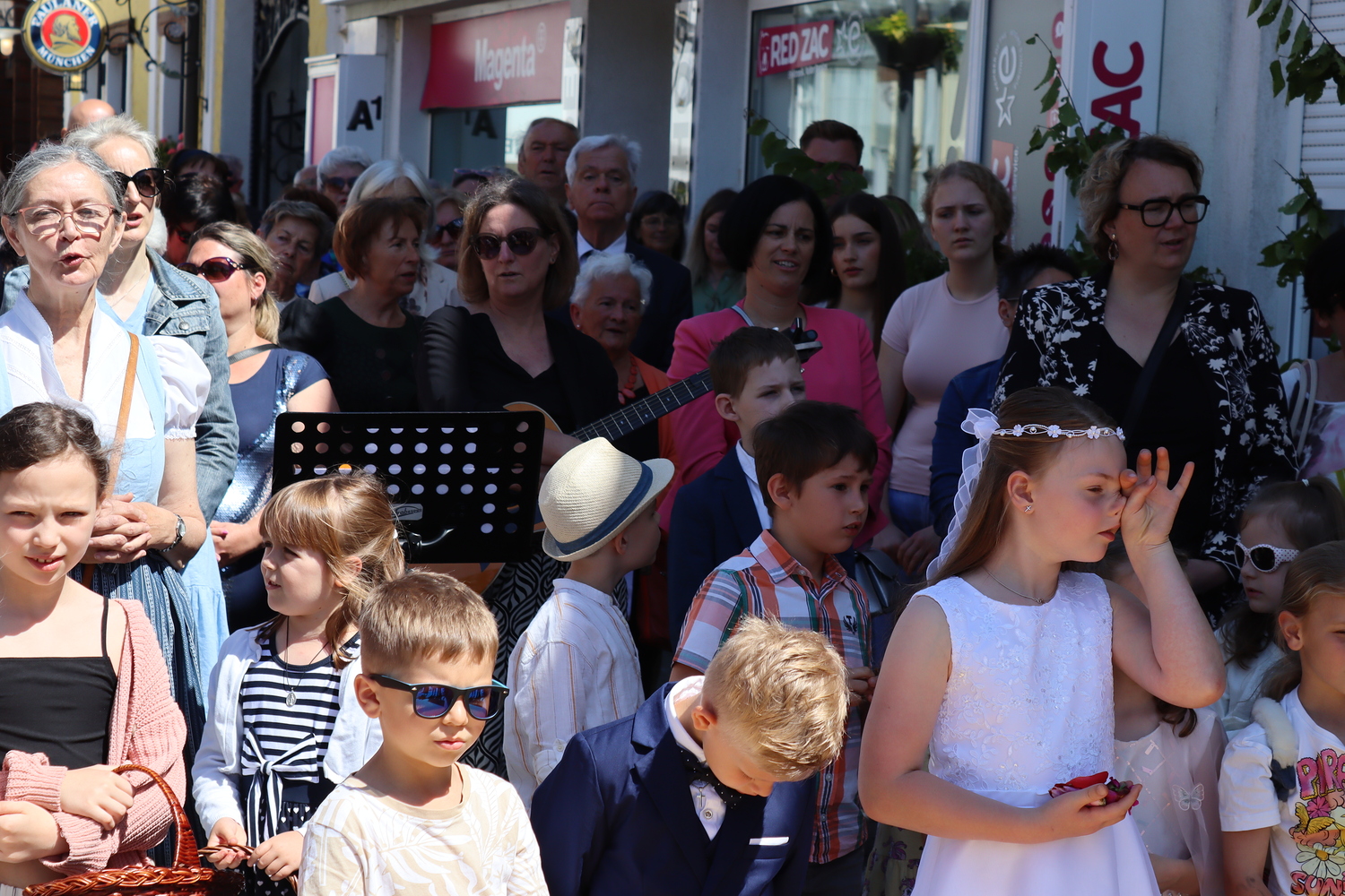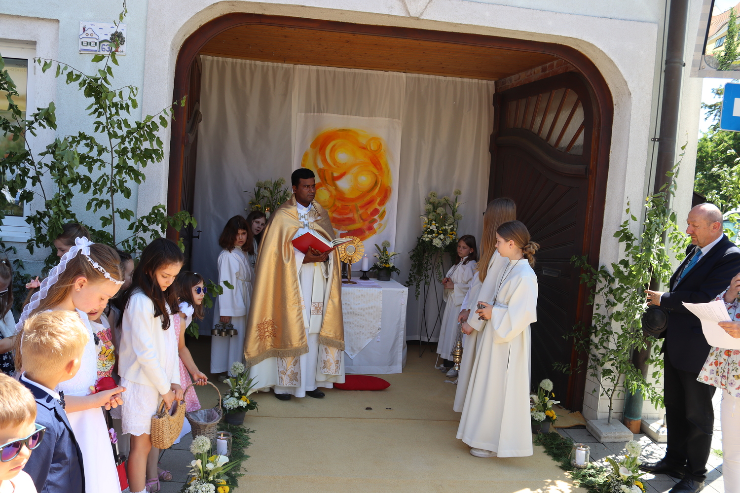 Die Heilige Messe am Fronleichnamstag 2024 wurde als Familienmesse gestaltet. Erstkommunionkinder, Ministrant:innen und alle weiteren kleinen und großen Besucher:innen konnten sich mit Liedern, Tänzen und Gebeten am Gottesdienst aktiv beteiligen.