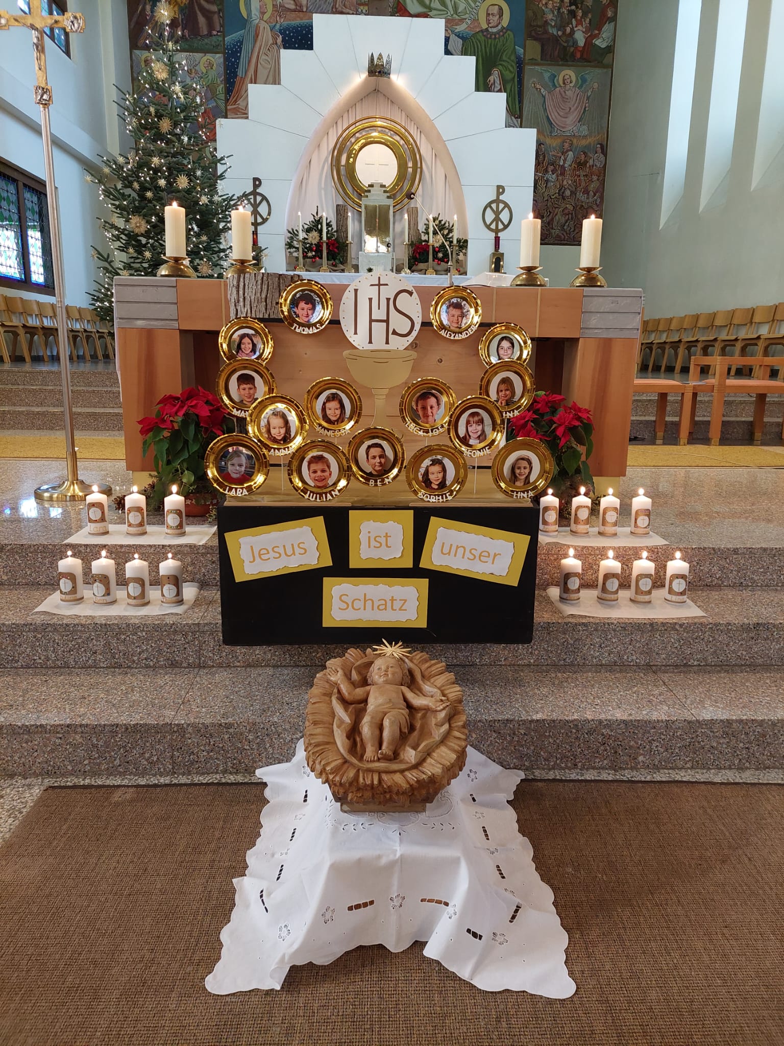 Dieses Motto haben unsere 15 Erstkommunionkinder als Thema ihrer Vorbereitung auf die Erstkommunion 2025 gewählt. Die Pfarre feierte am 12. Jänner bei ihrer Vorstellung mit. Trotz kurzer Probenzeit konnten die Kinder ihre Texte und Lieder super vortragen und singen. Die selbst gebastelten Kerzen und die von den Eltern gestaltete Schatzkiste glänzten dazu. Pater Deiva bezeichnete auch die Kinder selbst als Schatz für die Zukunft der Pfarre und wünschte viel Freude und Gottes Segen für die kommende Zeit. Am 29. Mai werden die Kinder den „Schatz“ Jesus empfangen dürfen. Wir alle freuen uns darauf!