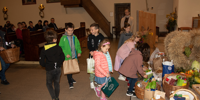 Unser Erntedankfest verband heuer wieder das frohe, dankbare Zurückschauen auf die Ernte des vergangenen Jahres mit dem dem Gedanken des Teilens. Die Kinder brachten zum Ausdruck, wie gut Gott selbst für uns alle sorgt und die Früchte wachsen lässt, die wir täglich brauchen, wie sehr wir aber auch unserer Nächsten bedürfen, die uns lieben und helfen - wie wir selbst im Umgang miteinander wachsen. Beim gemeinsamen Gabengang wurden viele Lebensmittelspenden zum Altar getragen und gesegnet, die für Menschen in Notsituationen bestimmt waren. Nach der hl. Messe wurde das Erntedankbrot verteilt und zur Agape am Kirchenplatz eingeladen. Die Ministrantinnen verteilten kleine Strohkreuze zur Erinnerung.
