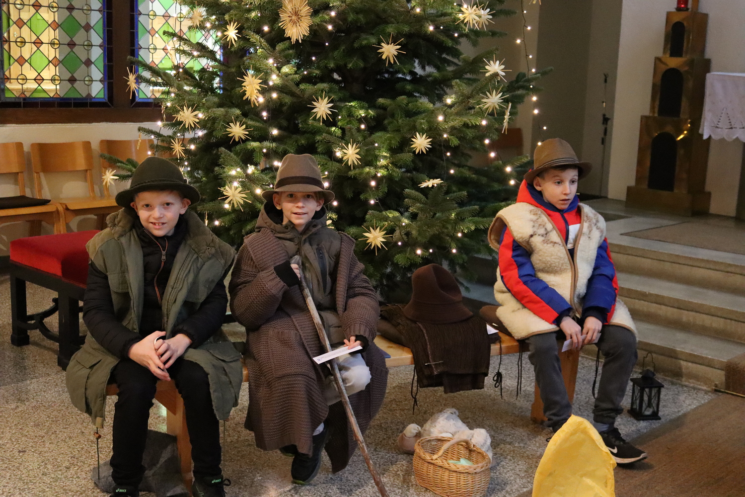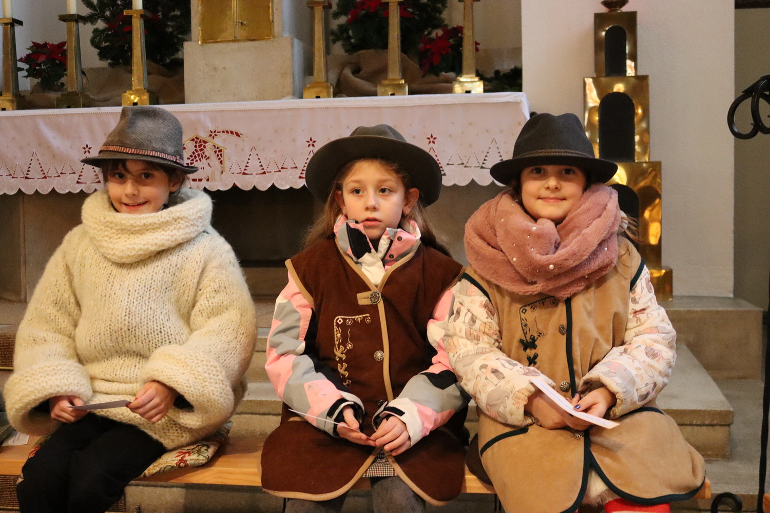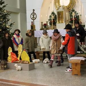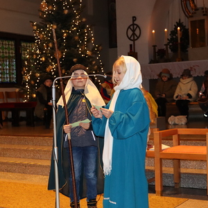 Ganz besonders viel Mühe gaben sich die Kinder am Heiligen Abend in der Kindermette. Sie verkündeten zusammen mit Pater Deiva das Evangelium von den Hirten, die auf den Feldern bei Betlehem sonderbare Zeichen und sogar Engel sehen. Die armen Hirten erzählten den Gottesdienstbesuchern, was sie in jener Nacht bewegte und wie sie Maria und Josef und das göttliche Kind fanden. Zu den Fürbitten legten sie Stroh in die Krippe, als Symbol für alles Armselige, scheinbar Wertlose, das Gott durch sein Wirken verwandeln kann. Die Musik von Arabesque machte die ganze Messe feierlich und stimmungsvoll, besonders als zum Schluss alle gemeinsam in der verdunkelten Kirche mit dem schönen, leuchtenden Christbaum das "Stille Nacht" anstimmten.