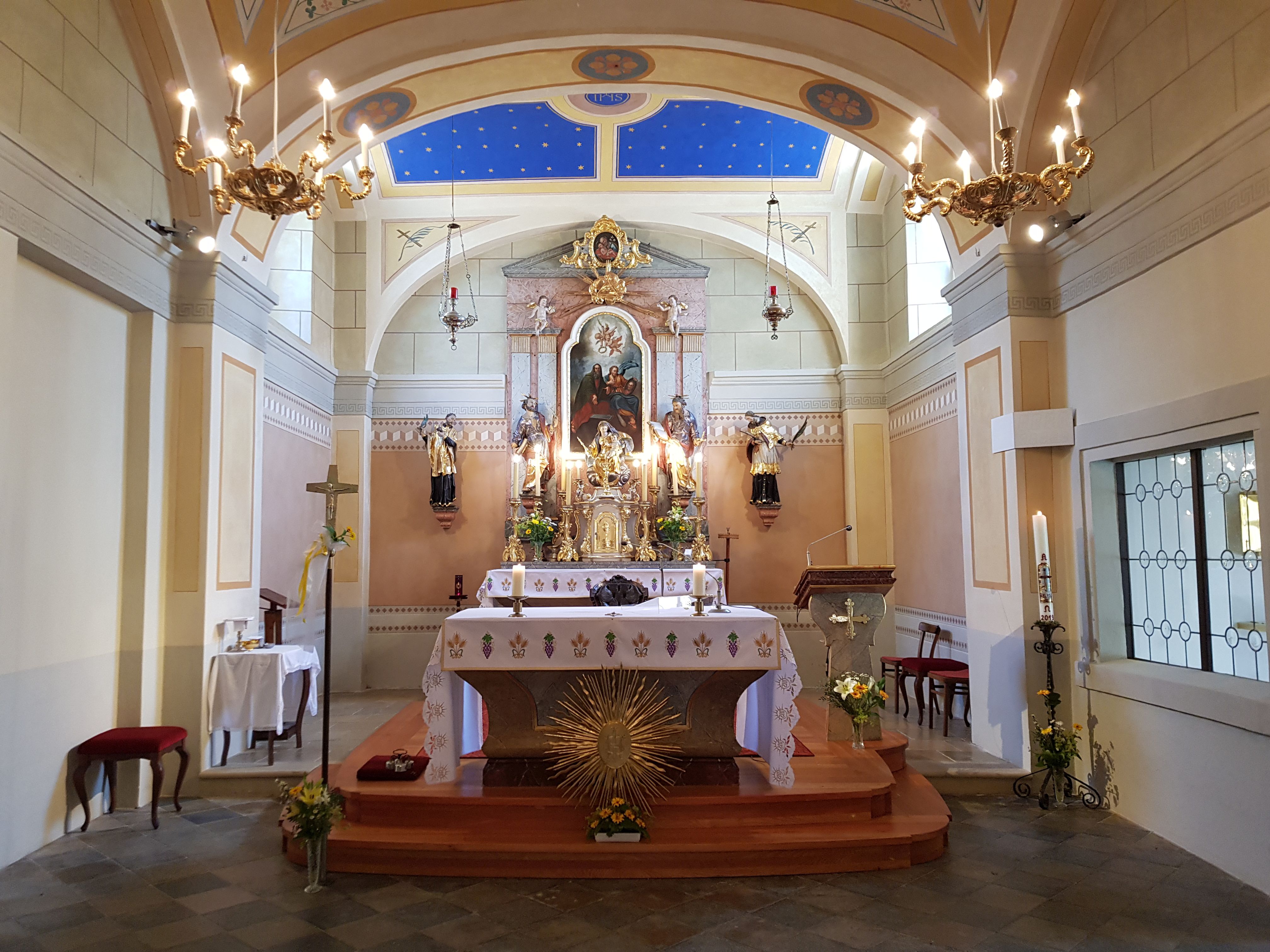 Den Hochaltar bildet ein an die Ostwand gerückter übergiebelter hölzerner Aufbau in spätklassizistischem Stil, auf dem das kleeblattförmige Altarbild der Kirchenpatrone, der heiligen Apostel Simon und Judas Thaddäus , zu sehen ist. Über ihnen sind zwei barocke Engel, ein Agnus Dei und im Giebel ein kleines barockes Bildoval mit dem Porträt des Hl. Josef mit dem Gotteskind zu sehen. Neben dem Altarbild sind auf Konsolen die unterlebensgroßen Figuren der hl. Apostel Petrus und Paulus dargestellt. Vor der Ostwand steht der Altartisch und auf diesem der Rokkokotarbernakel mit zwei kleinen Leuchterengeln. Über dem Tabernakel thront die aus dem 18. Jh. stammende hochbarocke, unterlebensgroße auf Wolken sitzende Statue der Mutter Gottes mit dem Jesukind. Zirka einen Meter links vom Altar steht auf einer Konsole die Statue des Hl. Philipp Neri, des Heiligen der christlichen Nächstenliebe. Rechts vom Altar ist die Statue des hl. Märtyrers Johannes von Nepomuk zu sehen.