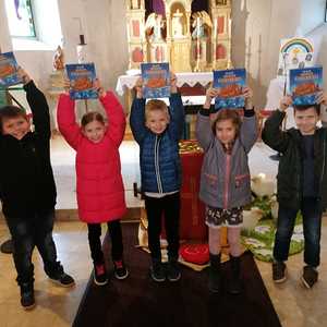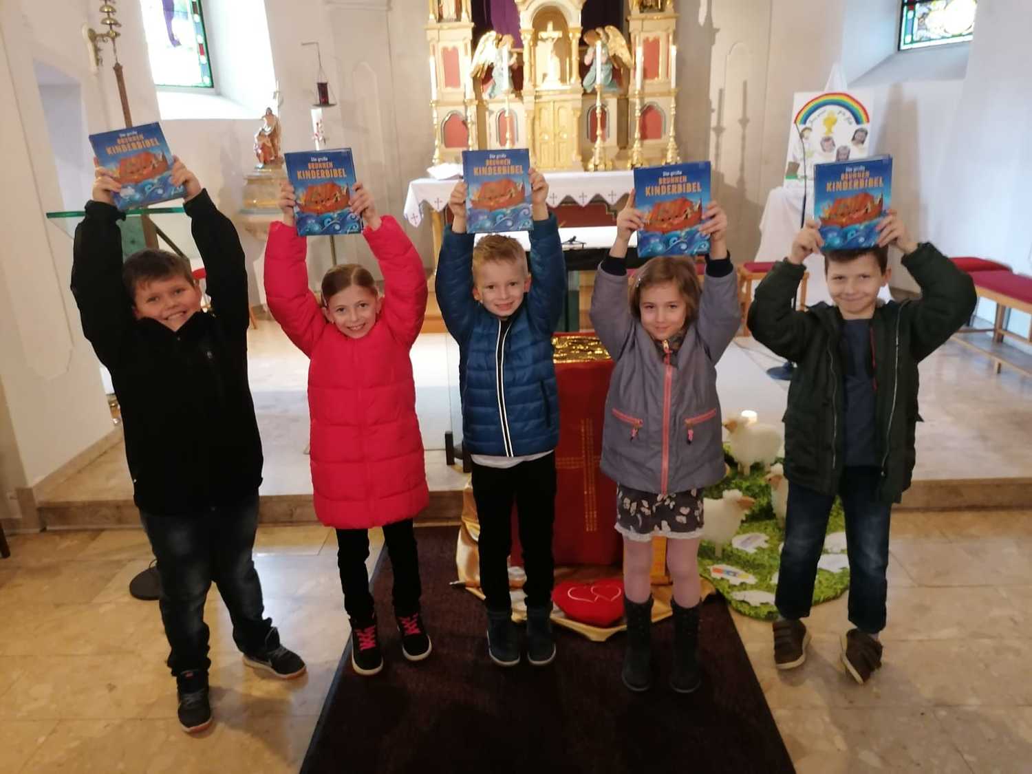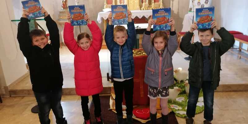 Am 8. März fand in Jabing die Bibelübergabe an die Erstkommunionkinder statt. Armin, Isabella, Leon, Max und Sarah freuen sich über ihre Kinderbibel.