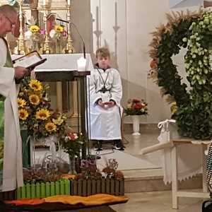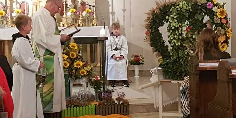 Das heurige Erntedankfest fand unter Mitwirkung vieler Kinder statt. Unsere - von einigen fleißigen und kreativen Frauen geflochtene Erntedankkrone - wurde von den jugendlichen Pfarrgemeinderätinnen feierlich in die Kirche getragen und von Diakon Gustav gesegnet.