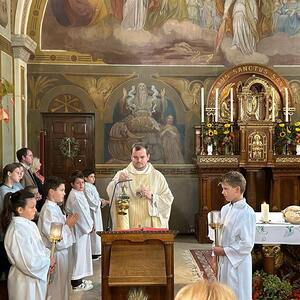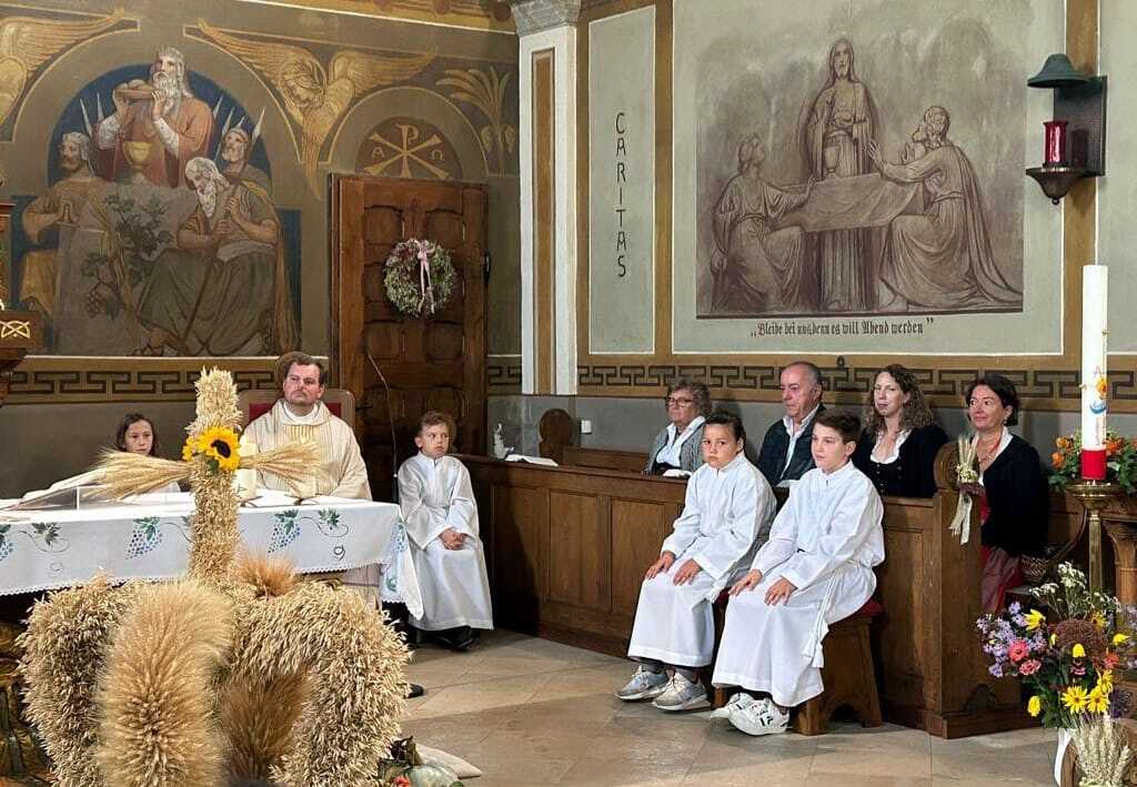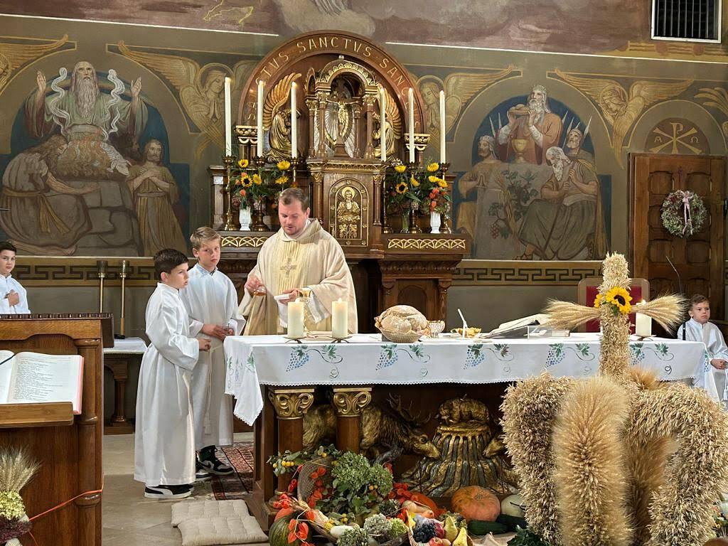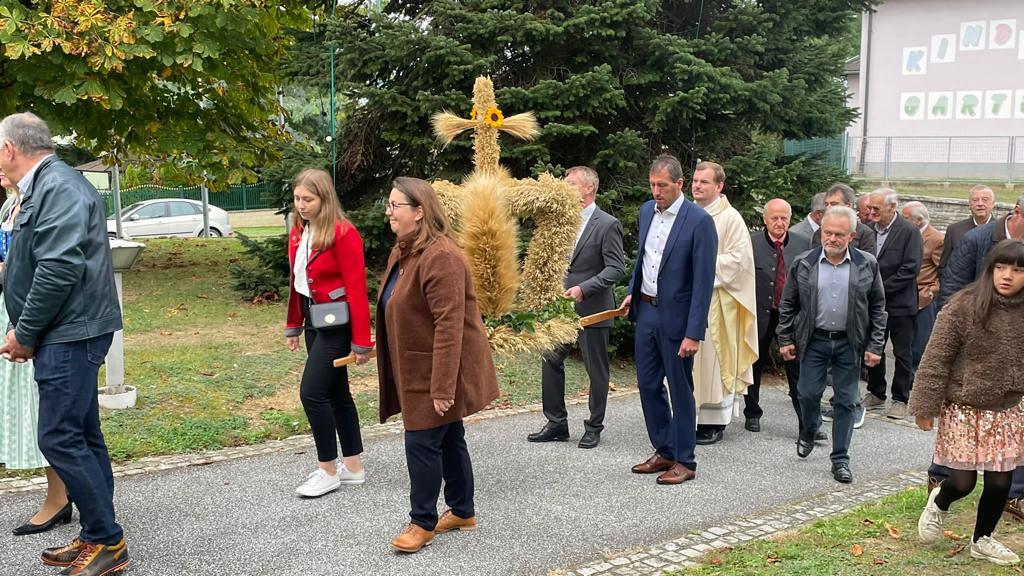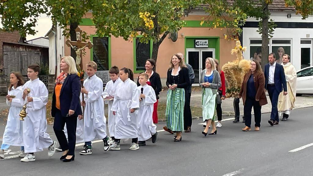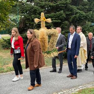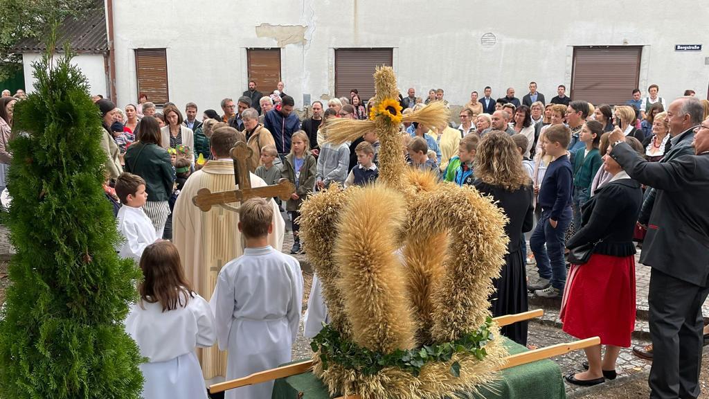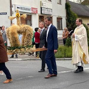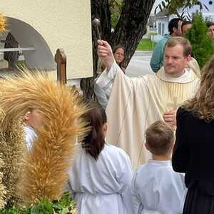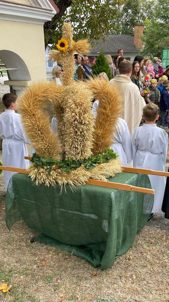 Am Sonntag, 8. Oktober feierte die Pfarre St. Michael ihr Erntedankfest. Traditionell wurde bei der Kapelle Bergstraße begonnen, wo die Kindergartenkinder mit ihren Päagoginnen ein passendes Gedicht und Lied als Einstimmung zur Segnung der Erntekrone und -gaben in die Feier einbrachten. Die Festmesse in der Pfarrkirche wurde von den Erstkommunionkinder des heurigen Schuljahres mitgestaltet. In seiner Predigt verglich unser Herr Pfarrer die Feld- und Gartenfrüchte mit den geistlichen Früchten in unserem Leben und ermutigte dazu, süße und gehaltvolle Früchte hervorzubringen - nicht saure oder verdorbene. Dazu bedürfe es der Kenntnis um geistliche Früchte und um ihre rechte Pflege und Hege.