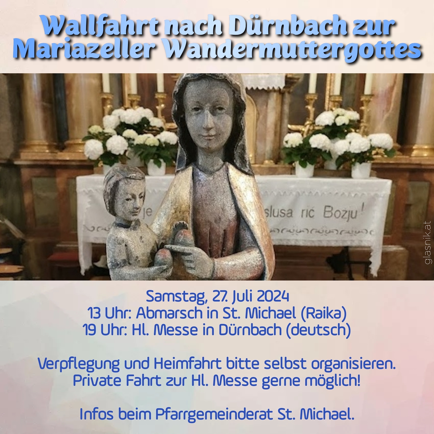 Die Wandermuttergottes wird jährlich bei der Kroatenwallfahrt in Mariazell von einer anderen burgenlandkroatischen Gemeinde übernommen. Damit kommt uns gewissermaße Mariazell ganz nah und wir sind eingeladen, die Marienstatue im Rahmen einer Wallfahrt aufzusuchen. Diese findet für St. Michael am 27. Juli 2024 statt: Abmarsch ist um 13 Uhr gegenüber der Kirche (Raika), die Hl. Messe in Dürnbach findet um 19 Uhr statt. Sowohl die Wallfahrt, als auch die Hl. Messe werden in deutscher Sprache sein.