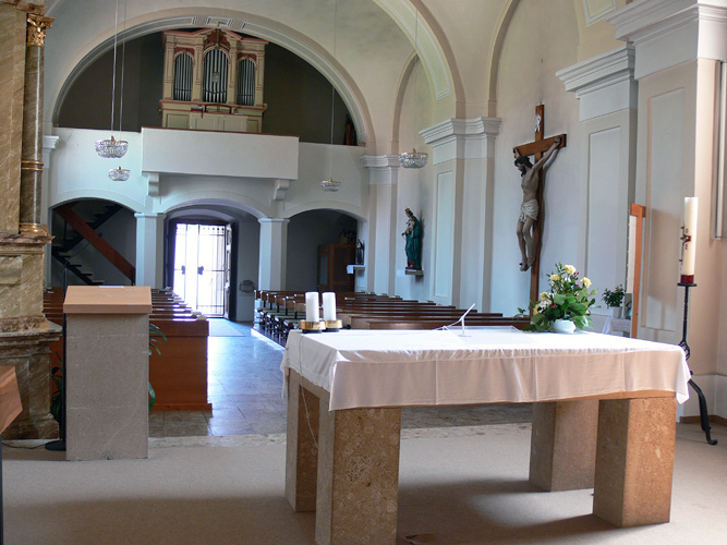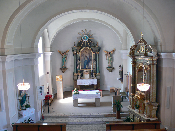 Erbaut 1853. Geweiht dem Heiligen Stephan. Rechteckbau mit eingezogenem, halbrund geschlossenem Chor und vorgebautem dreigeschoßigem Westturm mit Spitzhelm. Zweijochiges Schiff, Platzlgewölbe zwischen stuckverzierten Gurten auf breiten Pilastern. Dreiachsige Empore. Chorjoch durch rundgezogene Kehle vom östlichen Schiffspfeilerpaar zum Triumphbogen mit dem Schiff verbunden. Im Chorjoch quadratisches Platzl, in der Apsis Schalengewölbe. Volksaltar mit zwei barocken Engelfiguren an Apsiswand.