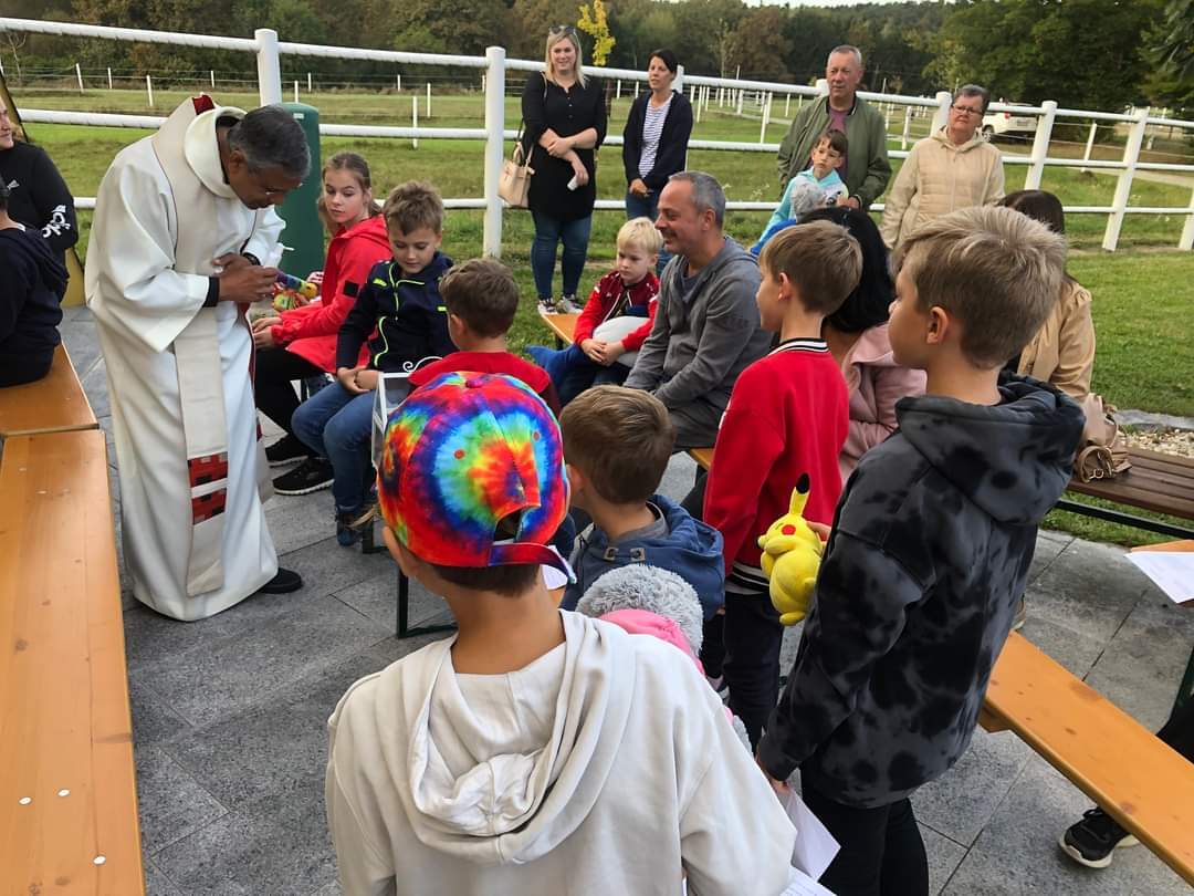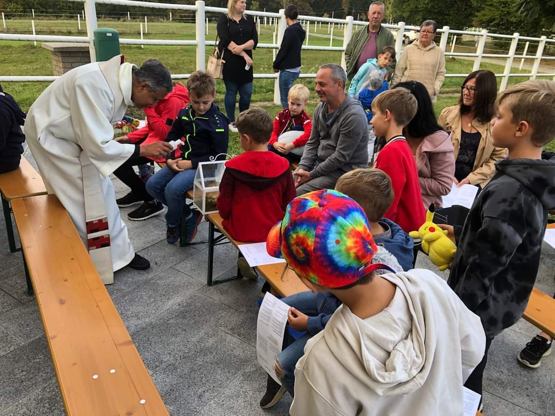 Hunde, Katzen, Hühner, Pferde, ein Pony, eine Gottesanbeterin und jede Menge Kuscheltiere wurden am Welttierschutztag von Pfarrer Thomas Vayalunkal gesegnet.