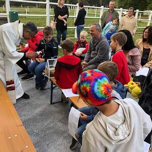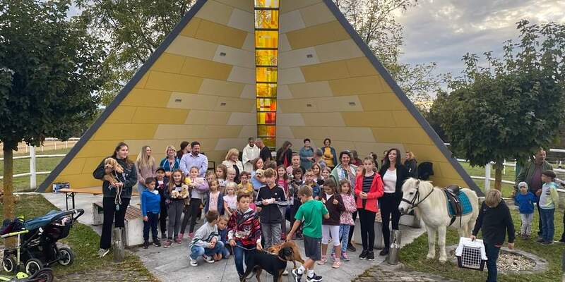 Die Regenwolken haben sich rechtzeitig verzogen und so stand der Segensfeier bei der Kreuzkapelle von Fam. Jandrisic nichts im Weg. Religionslehrerin Katharina Stipsits gestaltete die Tiersegnung mit kindgerechten Texten gemeinsam mit einigen Schüler_innen. Danke an Familie Jandrisic für die tolle Location inmitten der Pferdekuppel und die Agape im Anschluss.