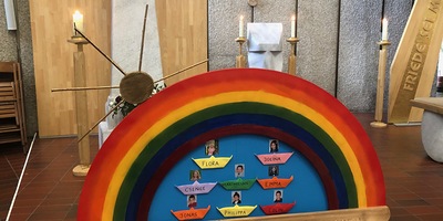 Das Symbol des Regenbogens begleitet drei Buben und fünf Mädchen auf dem Weg zur Erstkommunion.