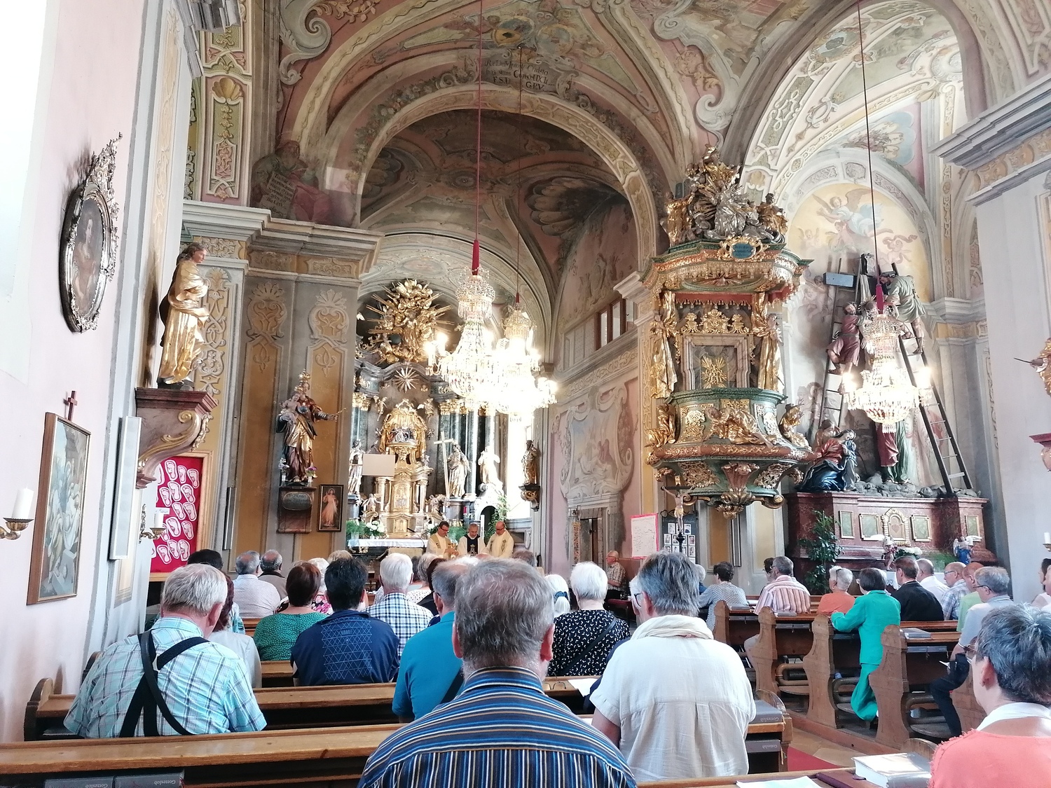 Die Mesnergemeinschaft der Diozöse Eisenstadt traf am 22.6. in der Wallfahrtskirche Maria Hasel im steirischen Pinggau zusammen. Um 10 Uhr wurde mit einem Einzug mit Prozessionsfahnen die heilige Messe begonnen. Geleitet wurde der Gottesdienst von Mesnerseelsorger Gereralvikar Michael Wüger, Rektor Josef Kuzmits sowie dem örtlichen Pfarrer Christoph Grabner, welcher nach der heiligen Messer im Rahmen einer Kirchenführung auch über die Geschichte von „Maria Hasel“ erzählte. Nach einem gemeinsamen Mittagessen fand eine Andacht in der Kapelle Maria Hasel mit abschließender Agape statt.